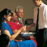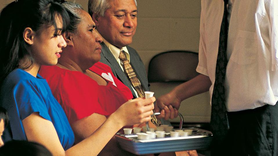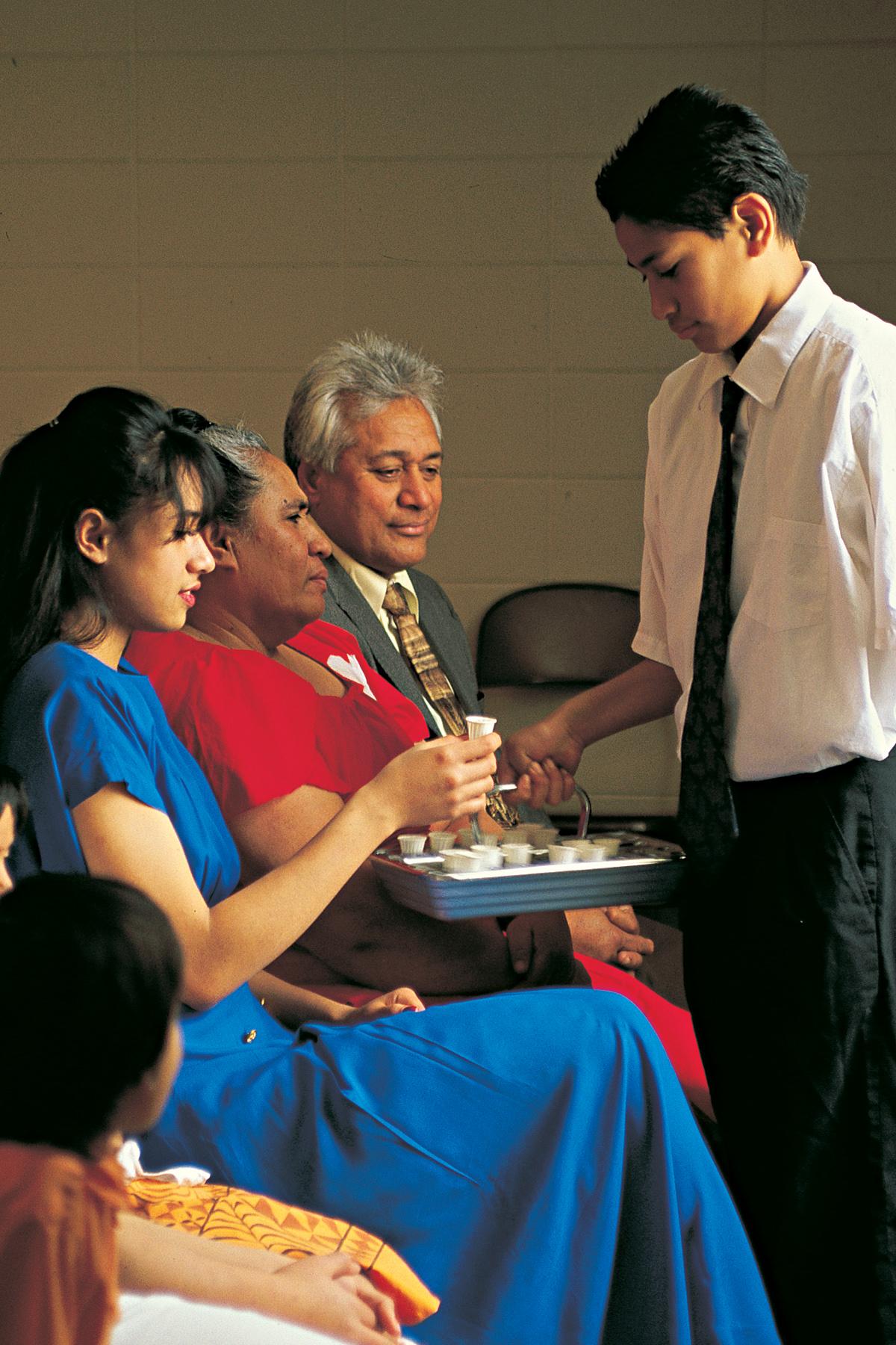 - The focal point of the 70-minute meeting comes next. The emblems of the “sacrament” — analogous to communion in other Churches — are blessed and passed. The blessing on both bread and water is performed by young men who have been ordained to various levels of priesthood responsibility. Members remain in their seats while the trays are passed along the rows of the congregation. During this period, the chapel is silent as each individual member reflects on the sacrifice of the Savior Jesus Christ.
