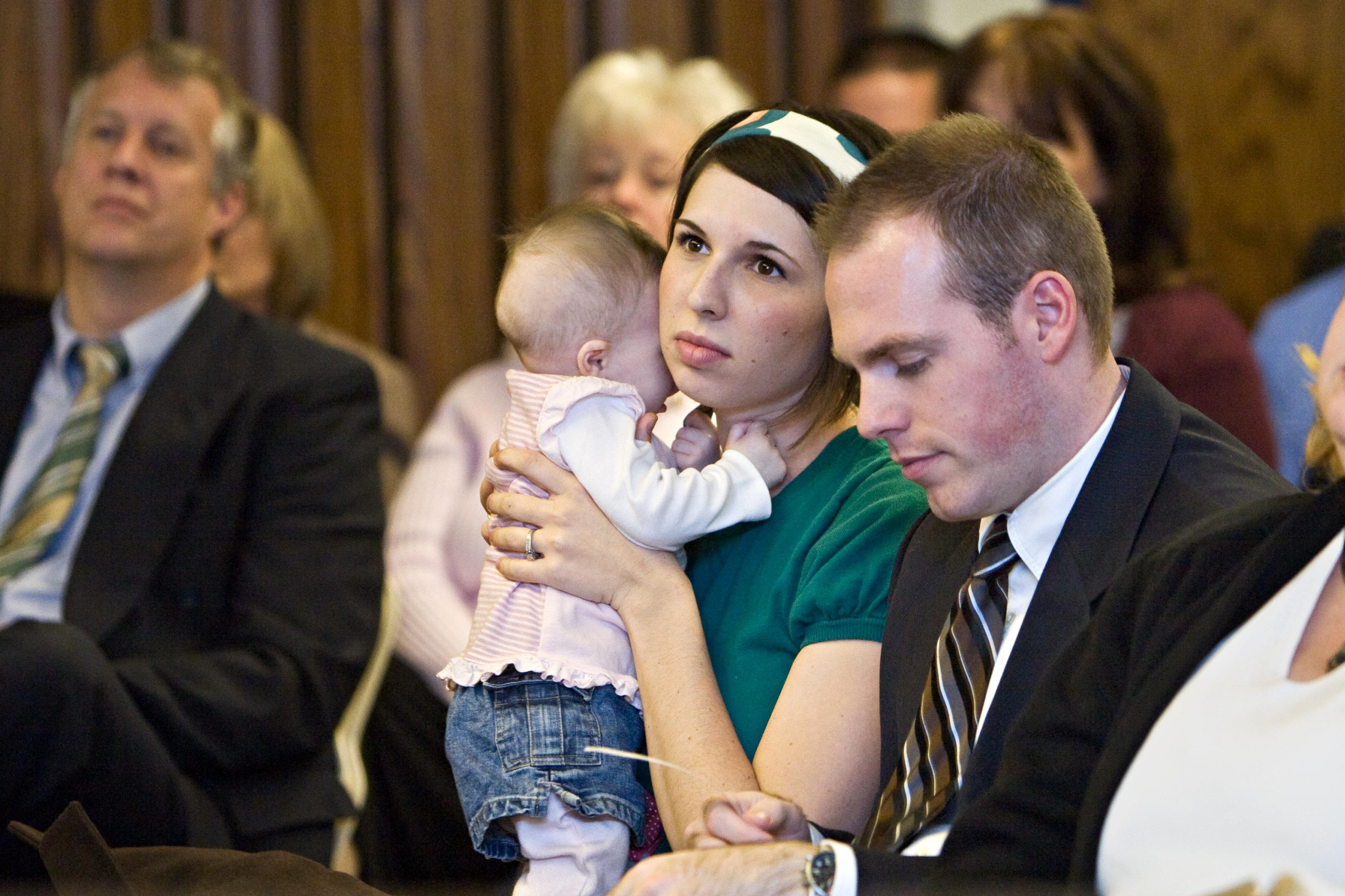 The chapel itself is a contemporary designed building with the name of Jesus Christ on the outside and pews for the congregation and a podium for speakers inside, but without icons and generally without elaborate decoration. Families generally sit together, but large numbers of single members also attend.