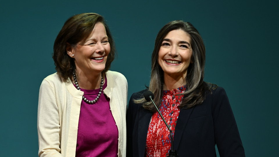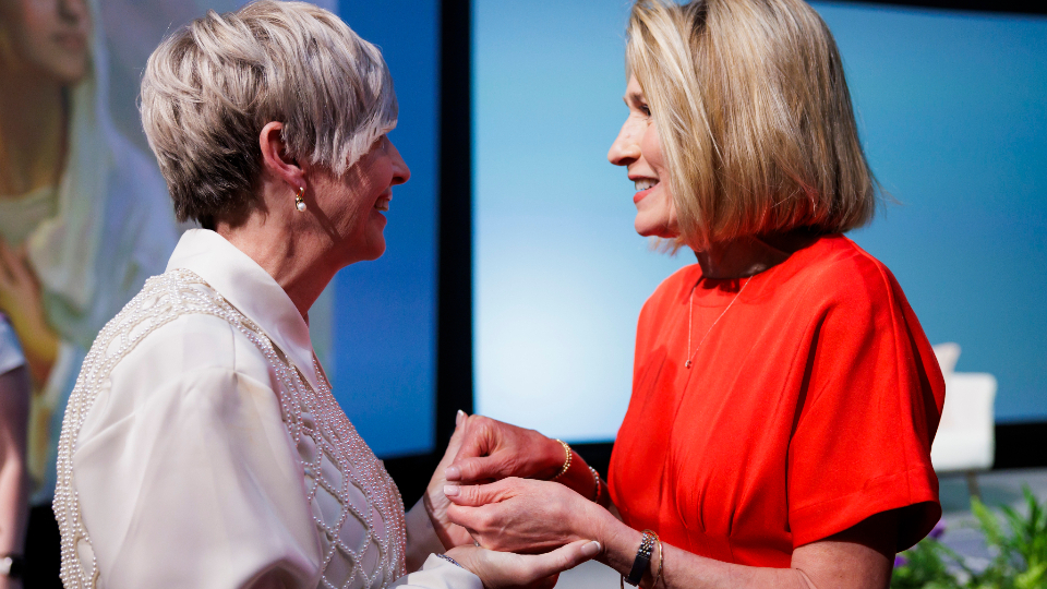 Young Women General President Emily Belle Freeman, left, speaks with Relief Society General President Camille N. Johnson in the Marriott Center during BYU Women’s Conference in Provo, Utah, on Friday, May 3, 2024. Photo by Christi Norris, BYU, courtesy of Church News.All rights reserved.“When I am firmly rooted in the truth that God loves us and directs His work through living prophets — when I know that ‘trunk doctrine’ — I can be content in not knowing the answer to a leaf question,” President Johnson said.