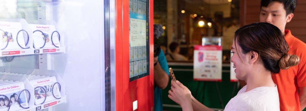 A woman in Christchurch, New Zealand, donates to a Giving Machine.© 2024 by Intellectual Reserve, Inc. All rights reserved.November 8
