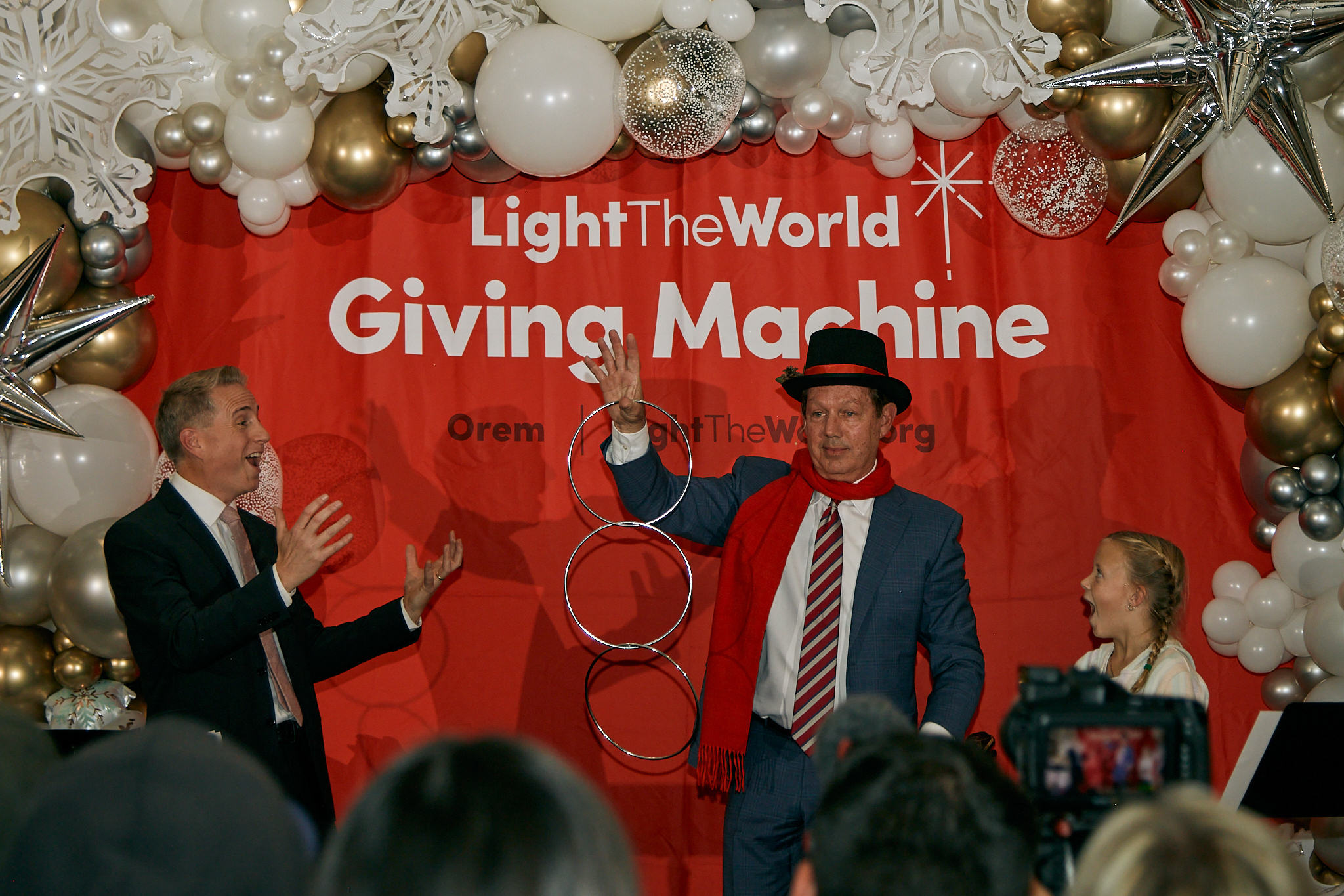 Emcee Kirby Heyborne looks on as Orem Mayor David Young performs magic for the crowd at a launch event for the newly unveiled Giving Machines at the University Place Mall in Orem, Utah, on Monday, November 25, 2024.2024 by Intellectual Reserve, Inc. All rights reserved.November 23