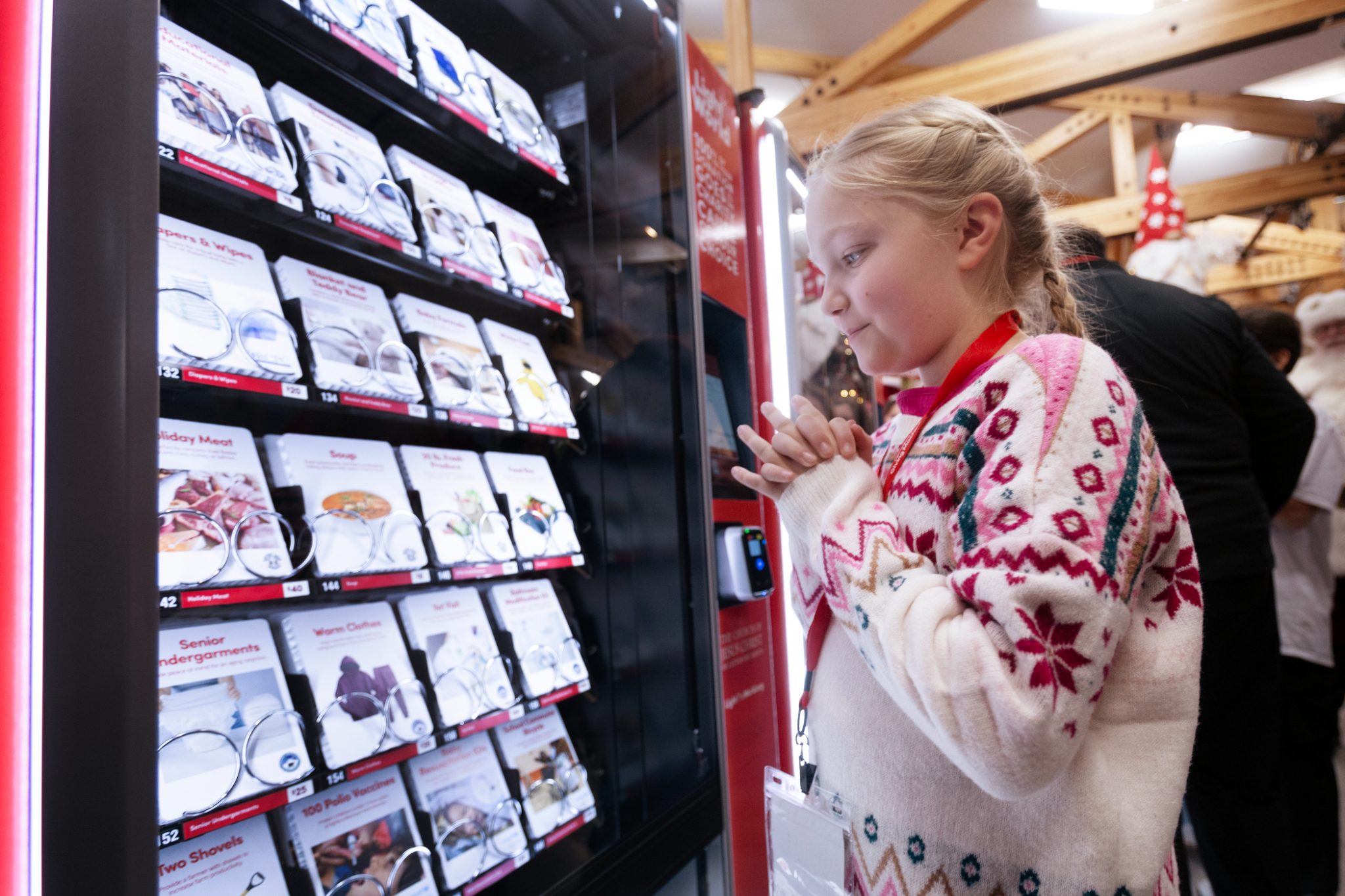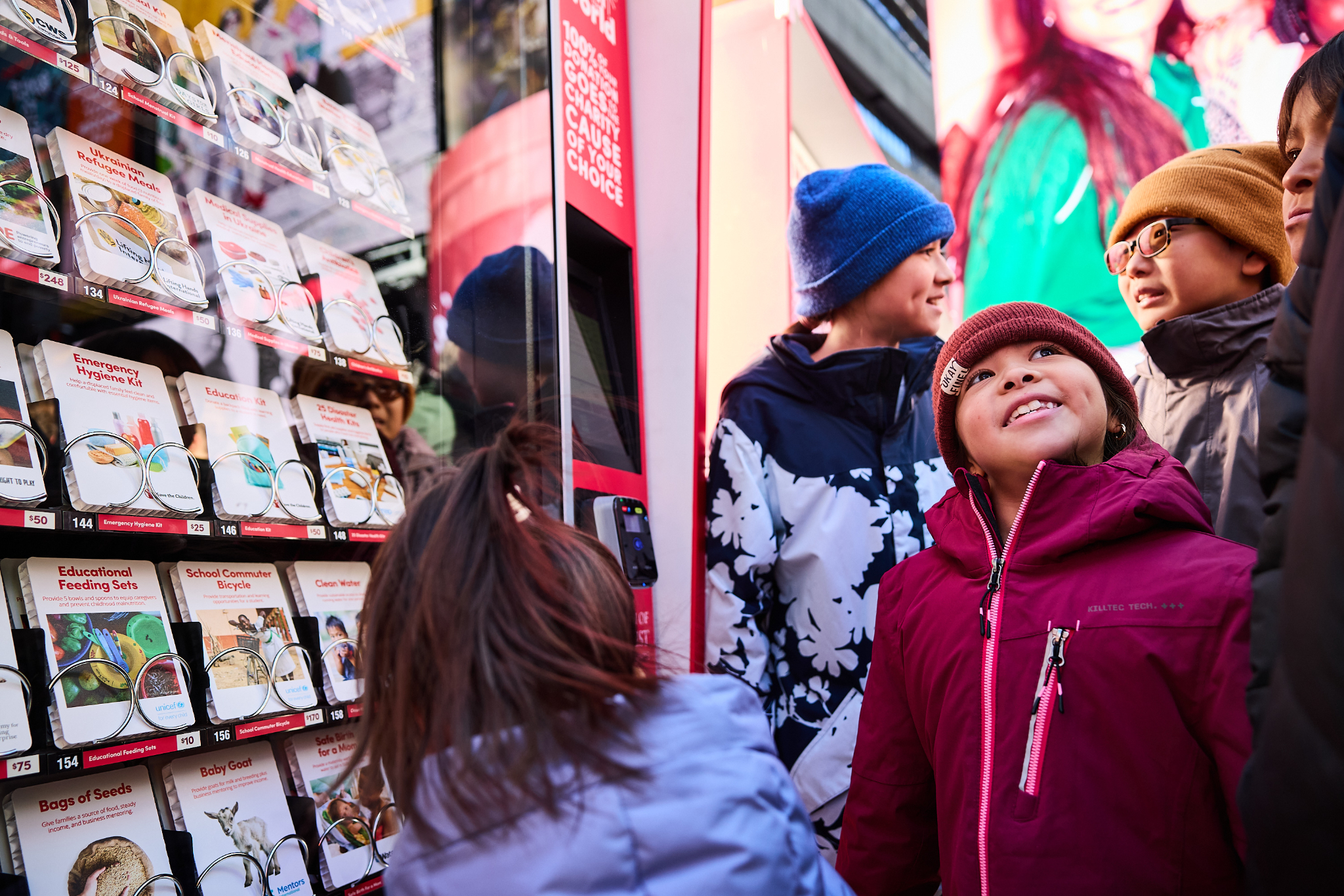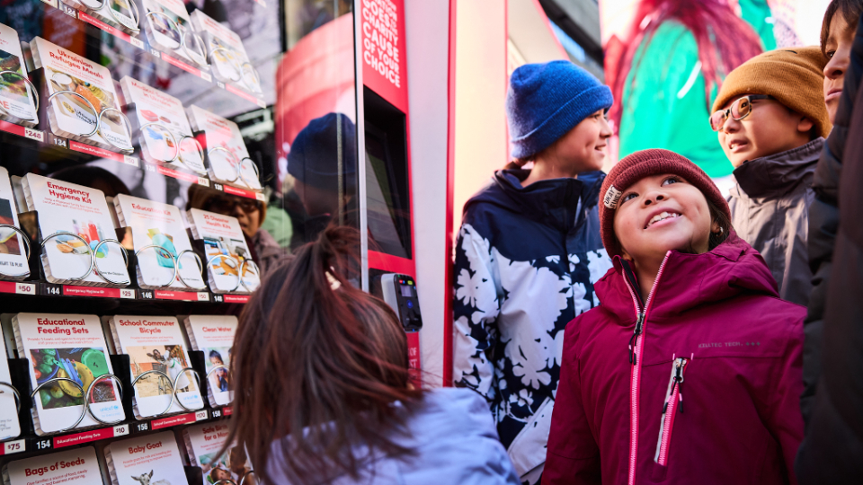 Instead of purchasing candy or snacks from a vending machine, people buy goods and services to support those in need. It’s a machine that enables a person to give — rather than receive. Items vary by city, but a typical machine includes food, clean water, clothing, shelter, healthcare, education support, hygiene kits, bedding, job and career training, and even livestock such as chickens, goats, pigs and beehives.