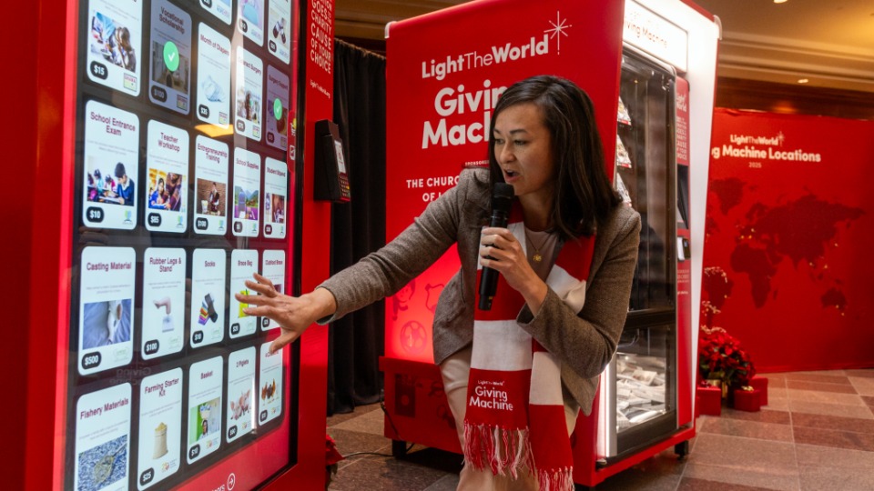 Tiffany Larson, CEO of Days for Girls International, was present for a media event at the Conference Center on Temple Square on Wednesday, November 12, 2025, where the season’s Giving Machine host cities were announced. She shared a story of a 15-year-old girl in Nepal who benefited from a Giving Machine gift of a feminine hygiene kit.