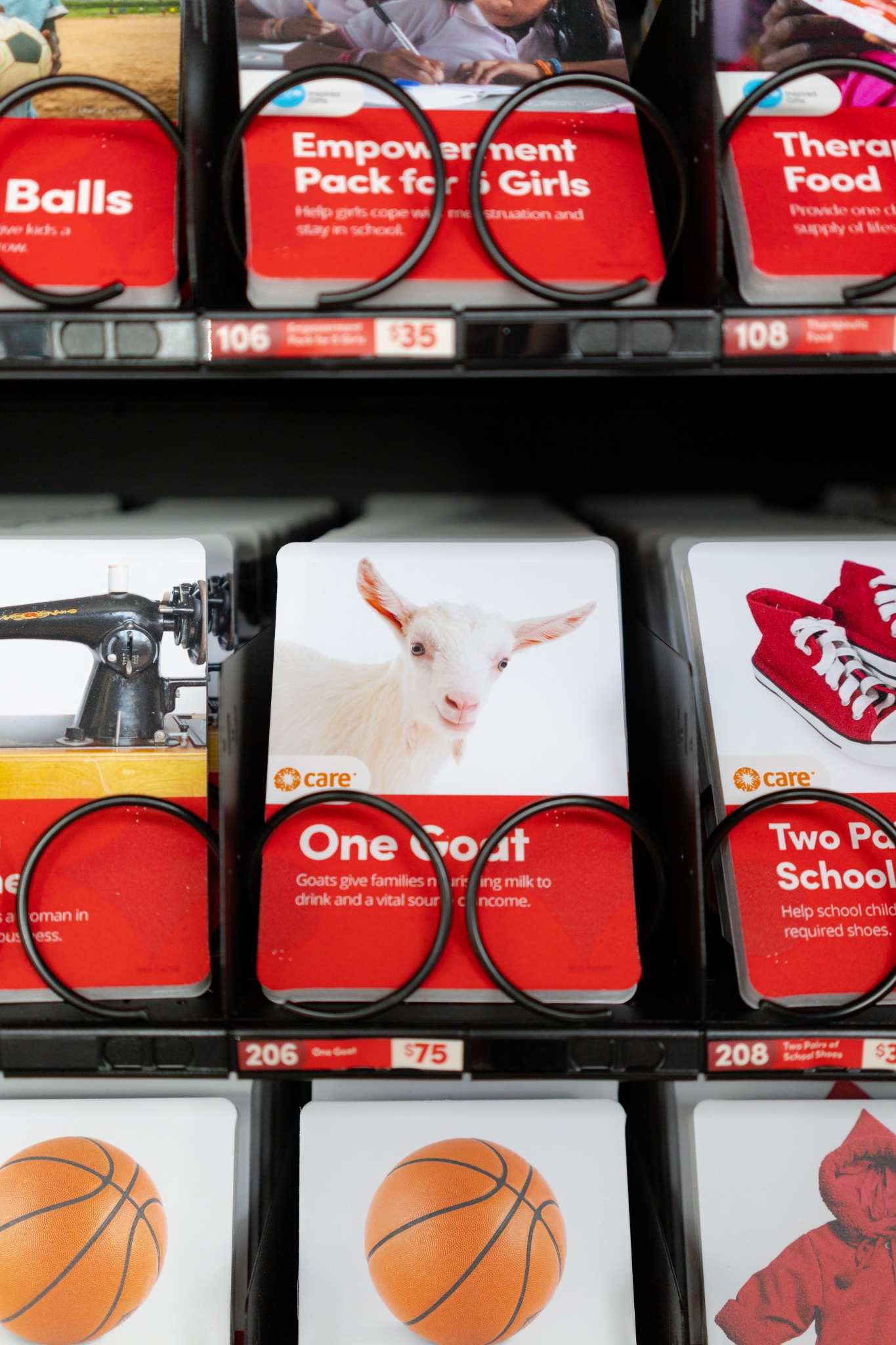 This year, users can purchase multiple items, if they wish, for people in need with one swipe of a credit card. Items range in price from $2 to $320 and include food, clothing, medicine, hygiene supplies, sporting equipment and livestock. The items will be supplied through partner charities such as UNICEF, Church World Service, WaterAid, Water For People and International Medical Corps.