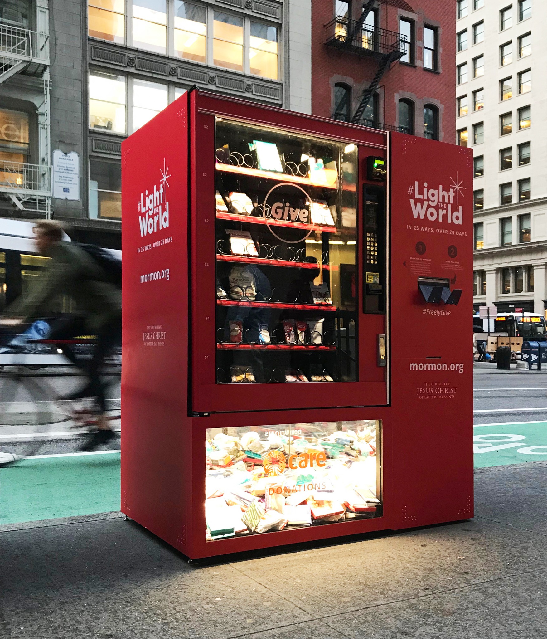 The popular #LightTheWorld campaign asks people to take the 25 days leading up to Christmas and turn it into a season of service, lifting and helping others in small and simple ways. While people usually put money into vending machines expecting to receive something in return, these Giving Machines provide a way for people to give instant acts of service and make a difference in their communities and the world.