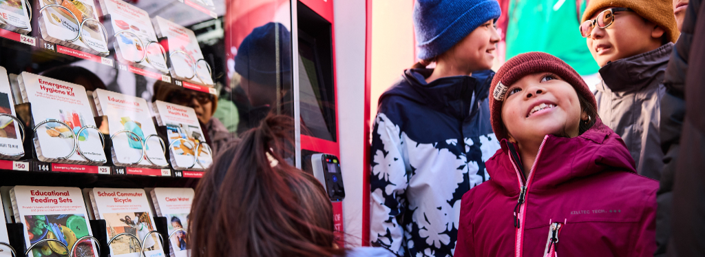 More than 500 local and international nonprofit organizations are participating in this year’s Giving Machine initiative. This year’s global charities are The Academy for Creating Enterprise, the American Red Cross, Care, Catholic Relief Services, Church World Service, Days for Girls International, iDE Global, Lifting Hands International, MAP International, Mentors International, Right to Play, Save the Children, UNICEF, Water Aid, and the World Food Program USA. Among the items available are food, shelter, clothing, healthcare, education, job and career training, and livestock.