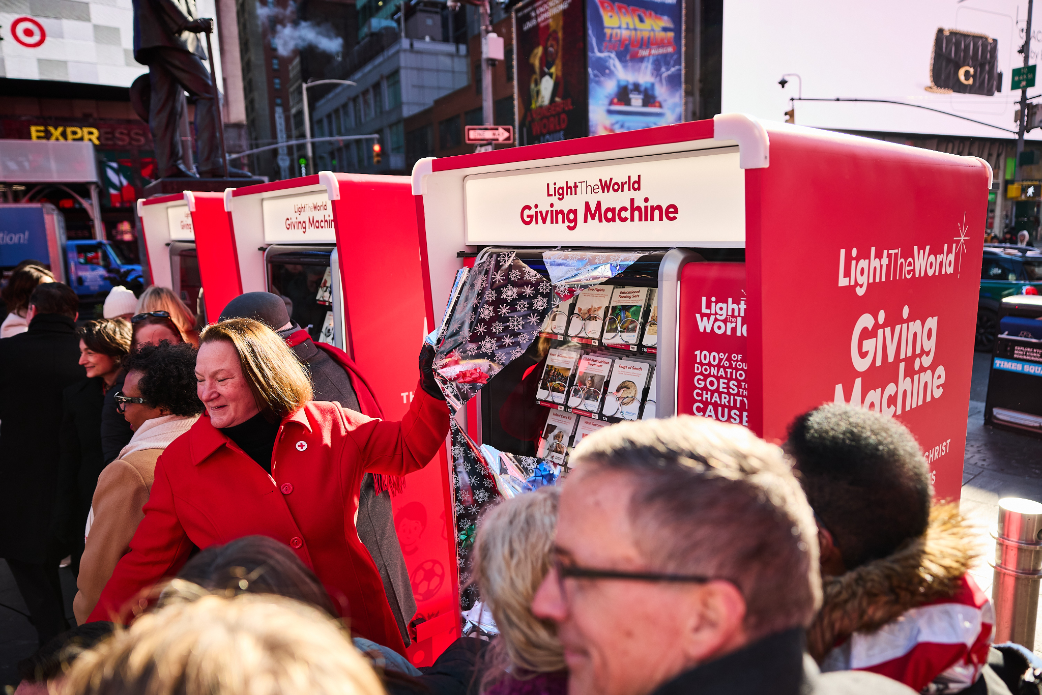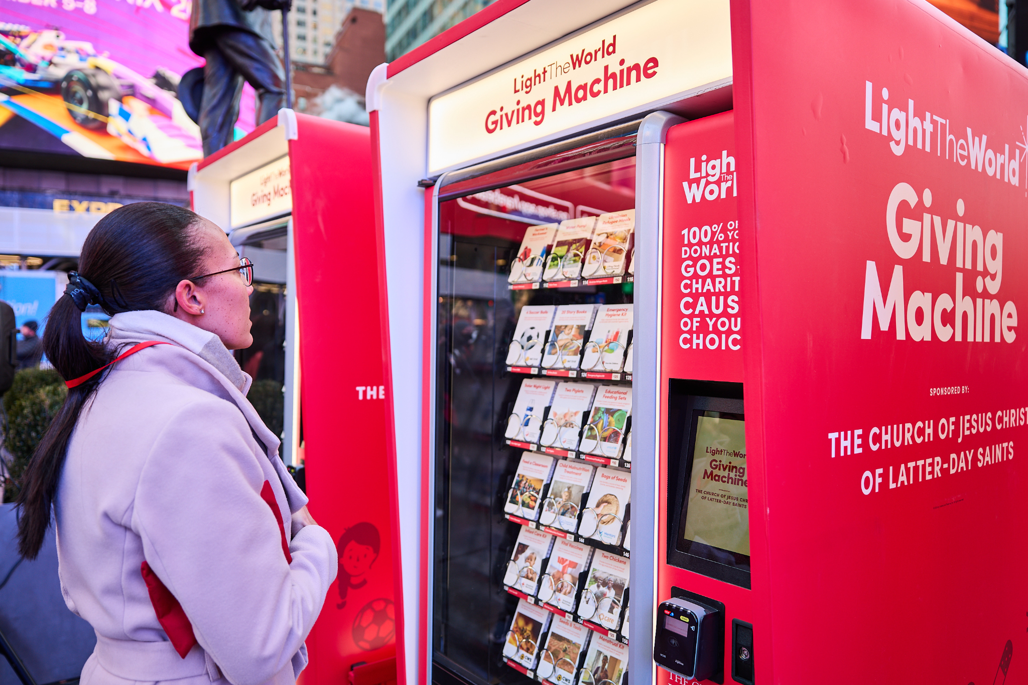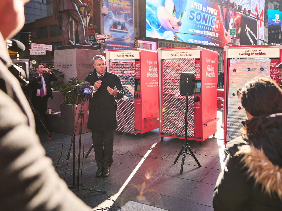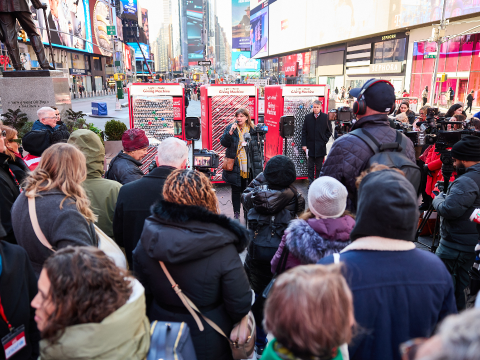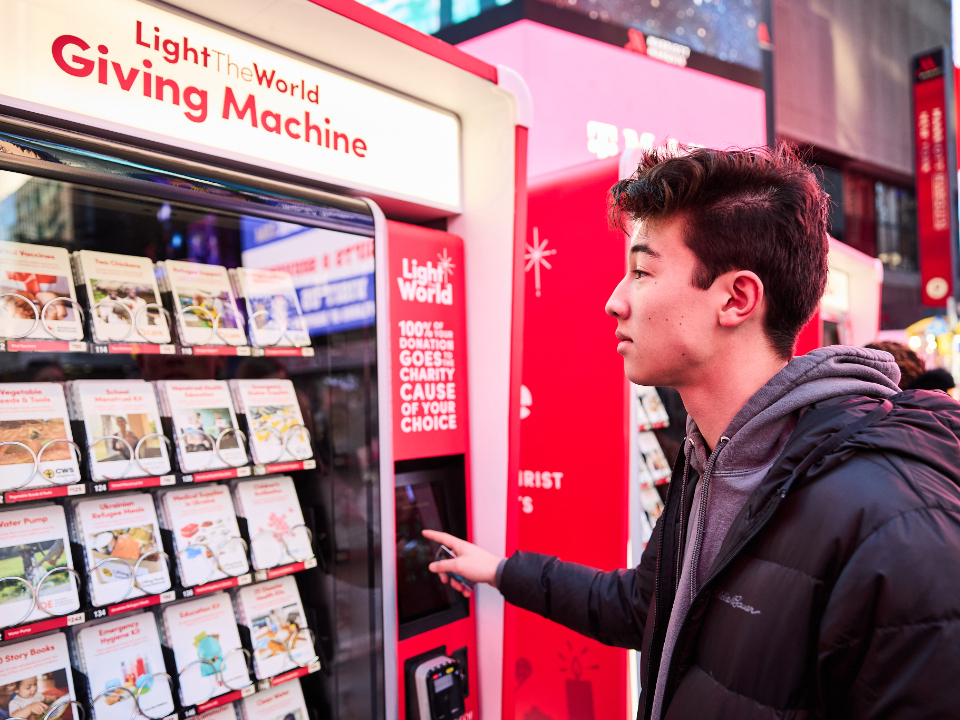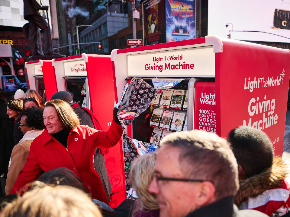 People passing through Times Square this Christmas season can lift others again by donating to a Light the World Giving Machine.