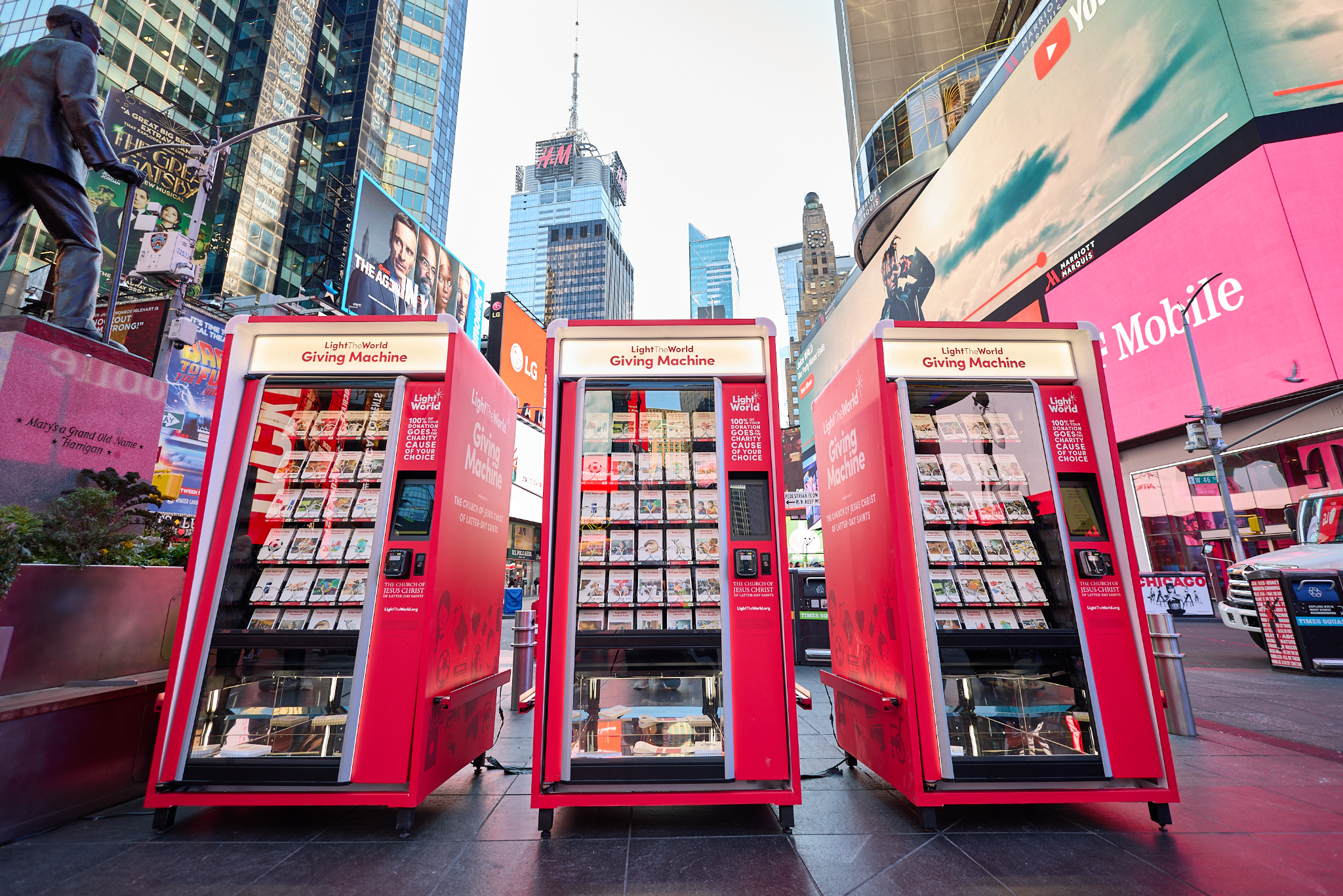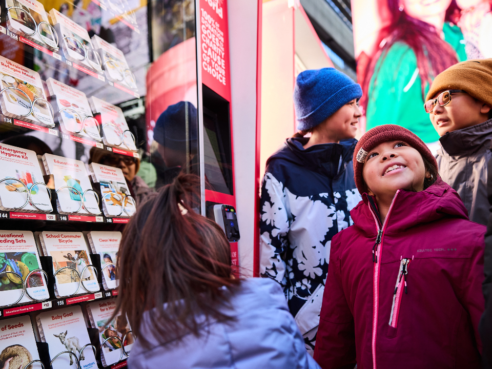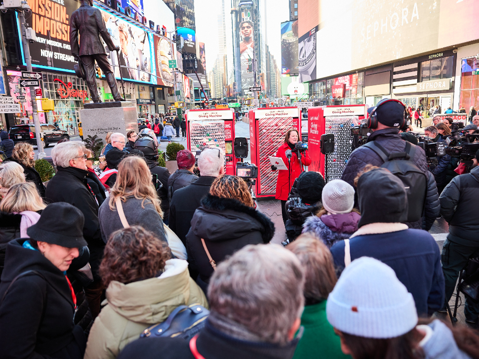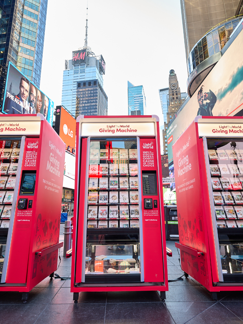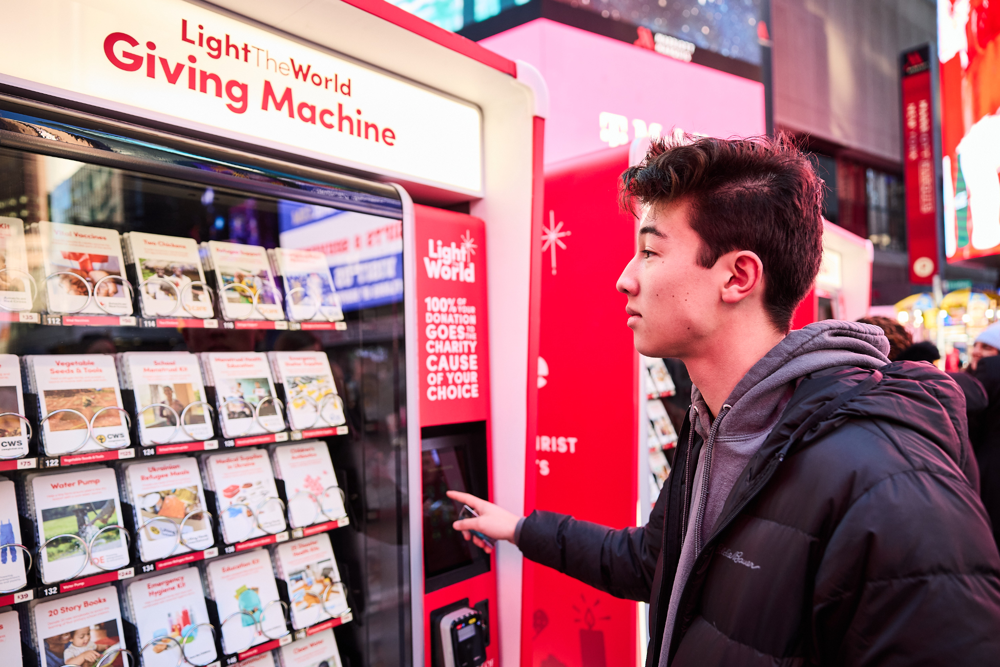 People passing through Times Square this Christmas season can lift others again by donating to a Light the World Giving Machine.