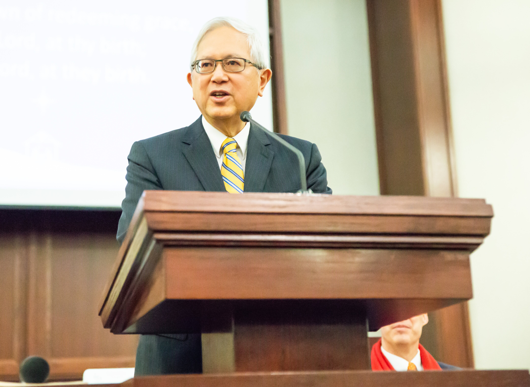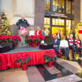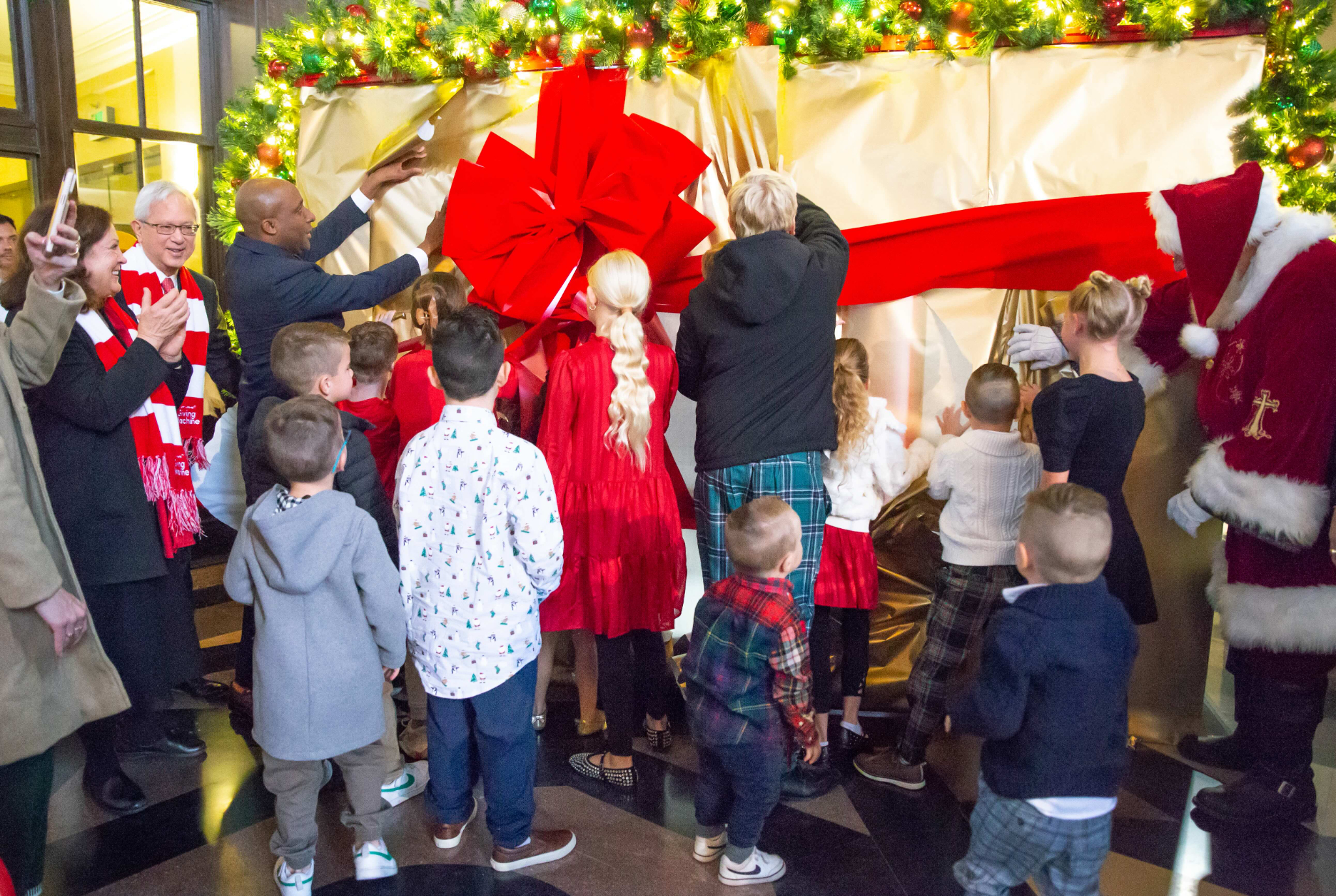 Elder W. Gerrit W. Gong, a member of the Quorum of the Twelve Apostles of The Church of Jesus Christ of Latter-day Saints, addressed a large holiday gathering of families, noting the benefit of the Giving Machines.