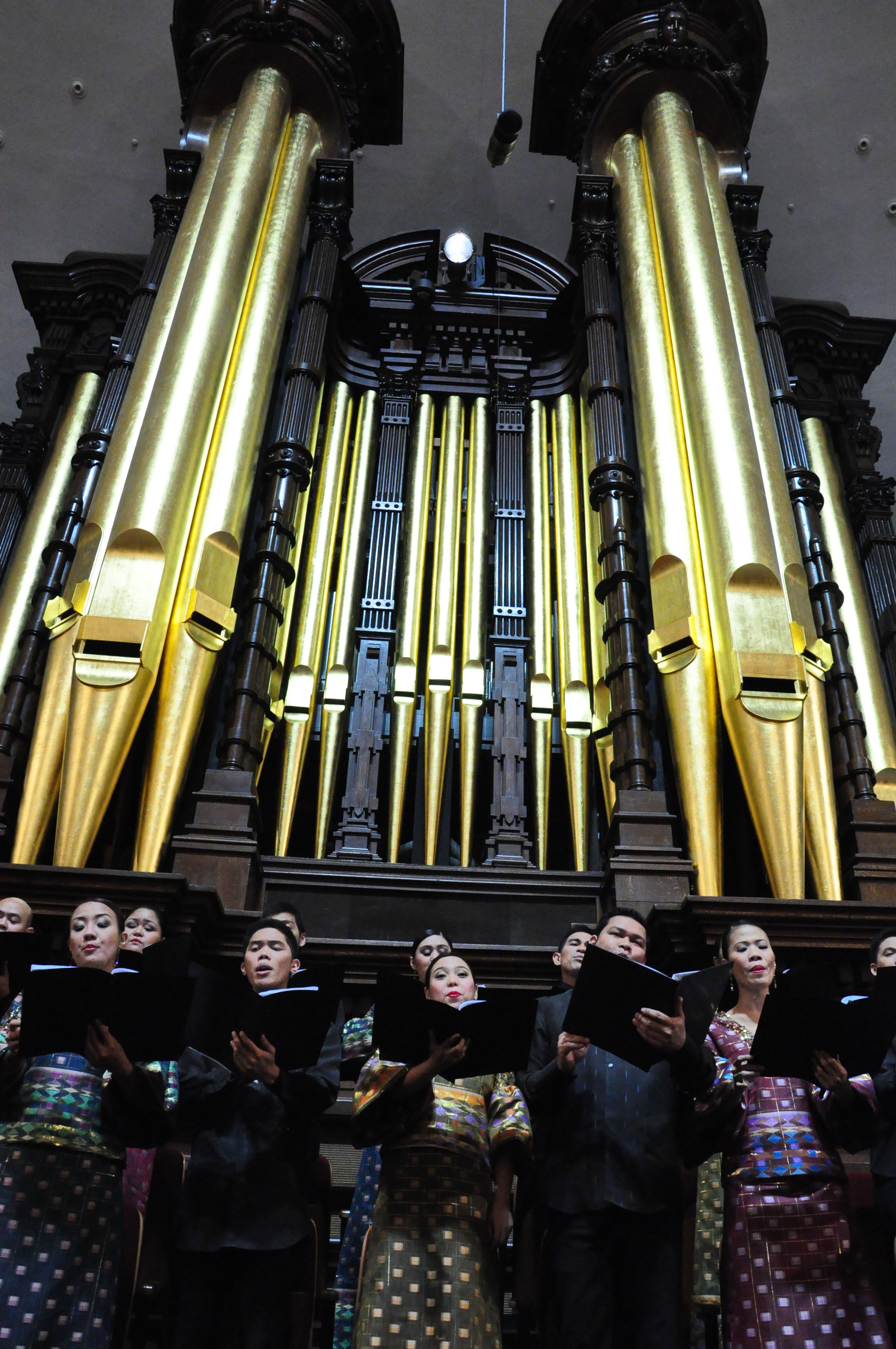 The Philippine Madrigal Singers below the Tabernacle's iconic pipe organ during Music and the Spoken Word performances on 17 April 2011