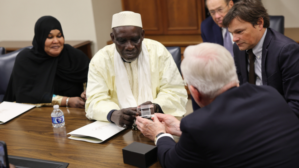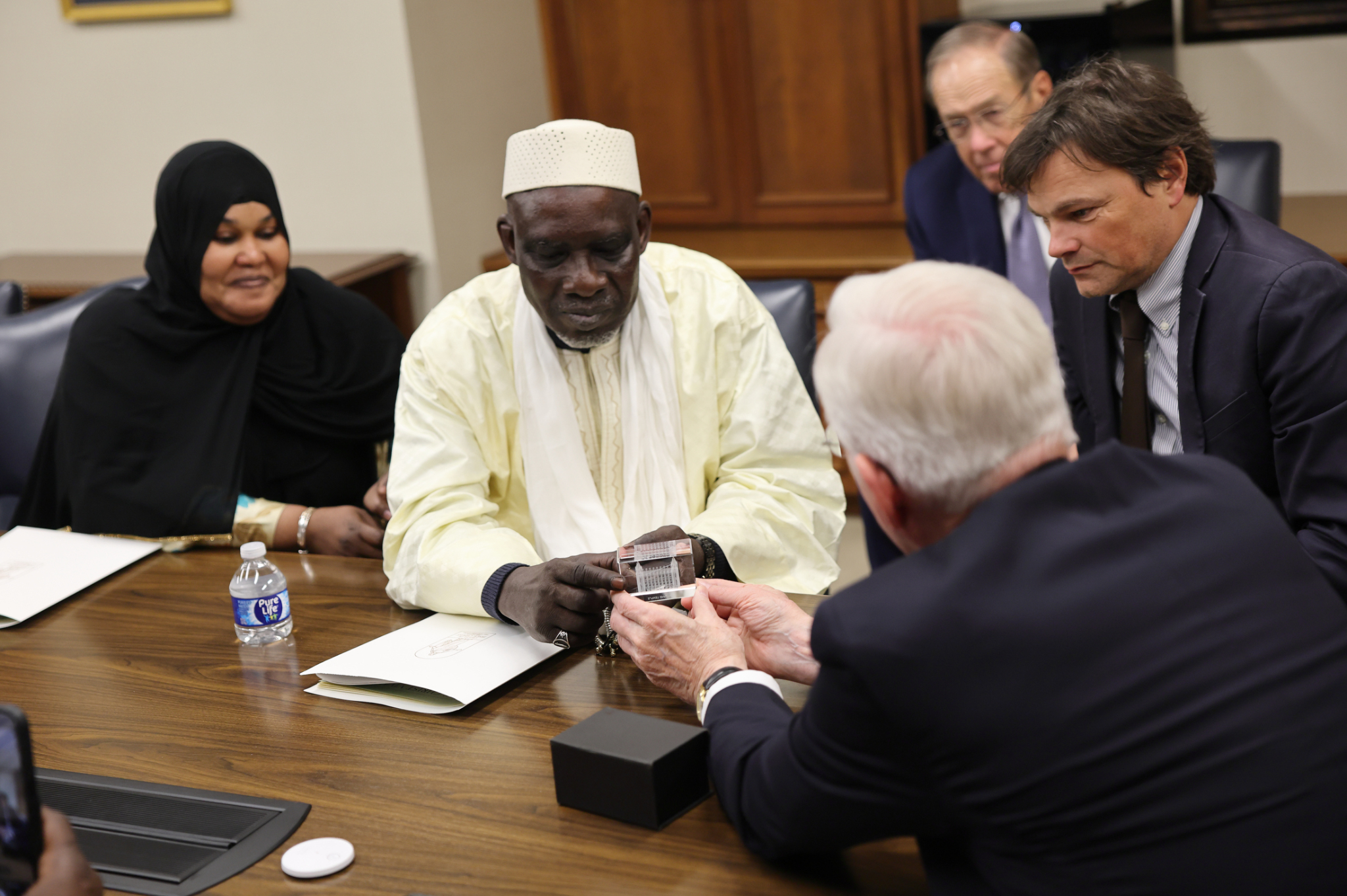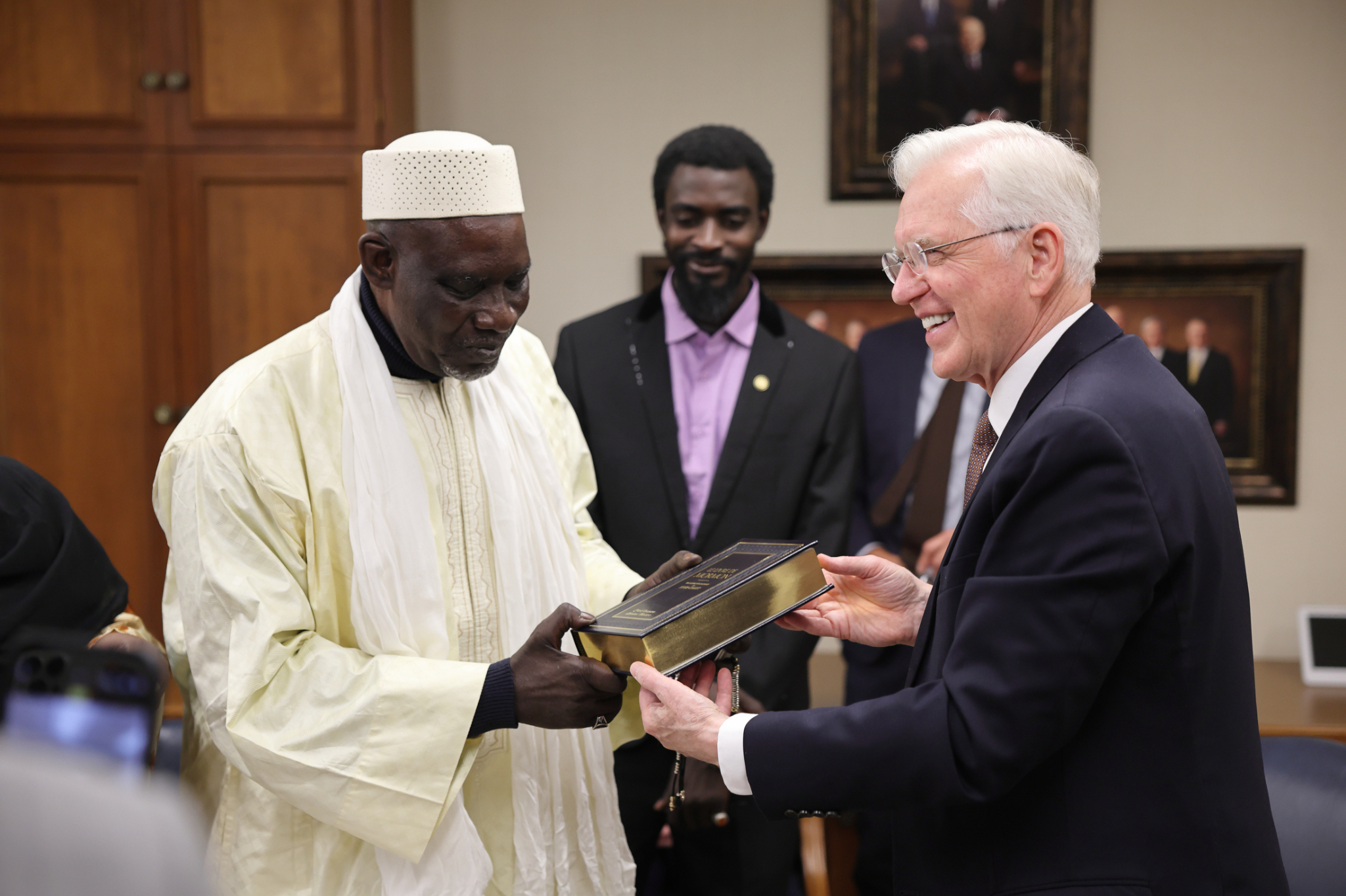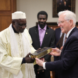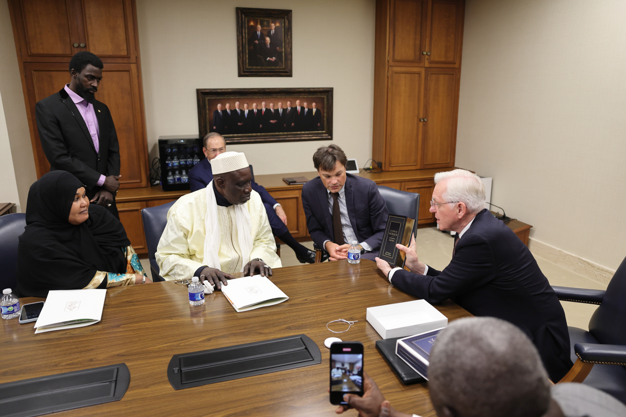 Elder Christofferson presented Haïdara with a French copy of the Book of Mormon.