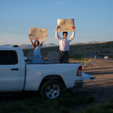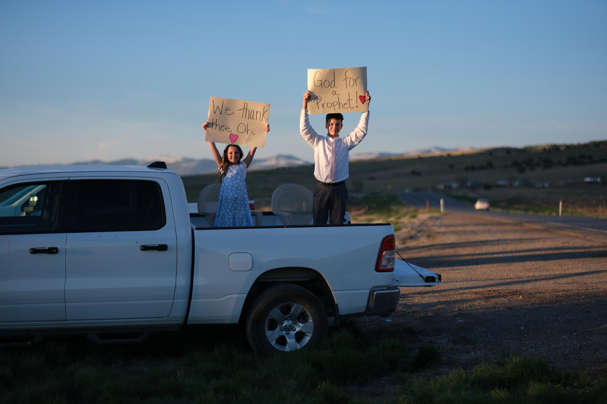 Kaden and Carrington Dyches from Ephraim held signs welcoming President Russell M. Nelson to the Sanpete Valley for the Manti Utah Temple rededication on Sunday, April 21, 2024. 2024 by Intellectual Reserve, Inc. All rights reserved.Temples in Utah