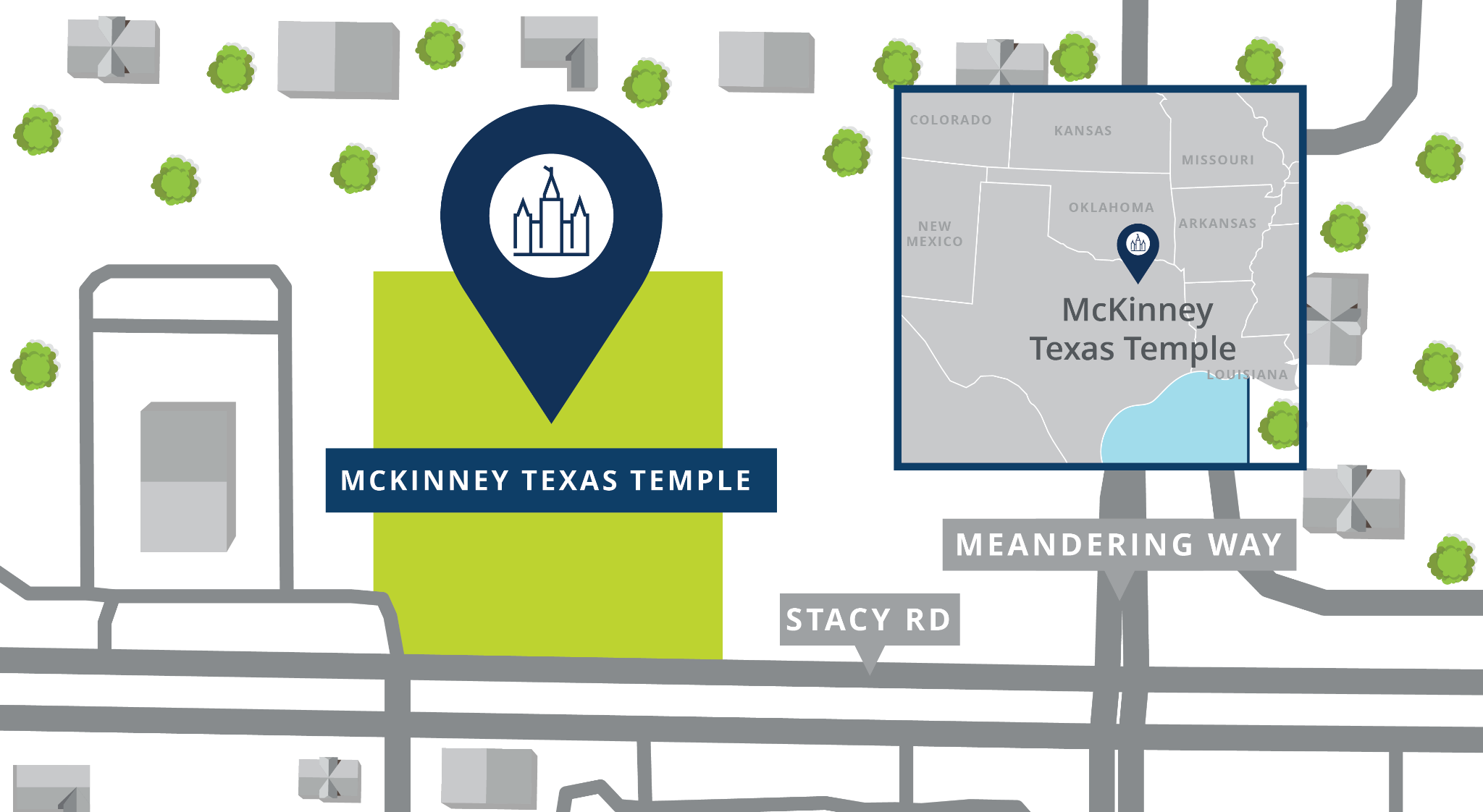McKinney Texas Temple Site Location.2023 by Intellectual Reserve, Inc. All rights reserved.This temple will be built on an 8.16-acre site located along Stacy Road adjacent to and east of an existing meetinghouse at 651 East Stacy Road, in Fairview, Texas.