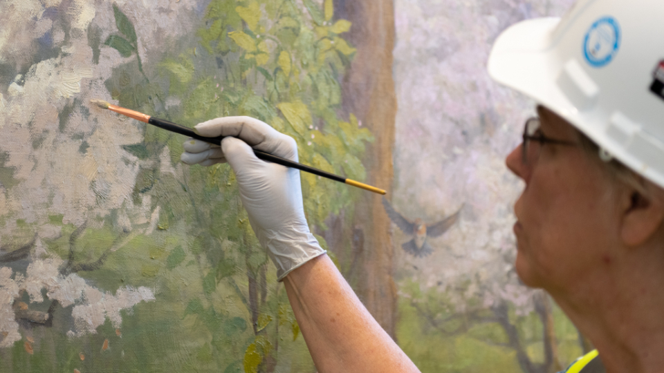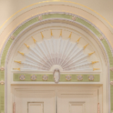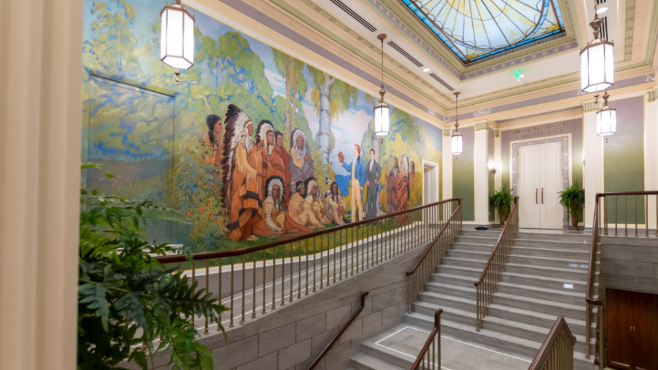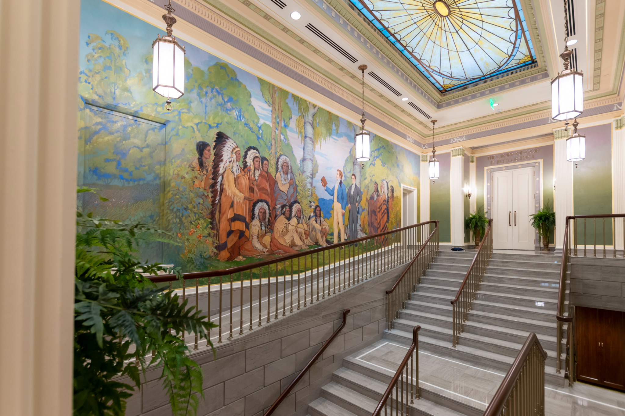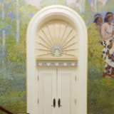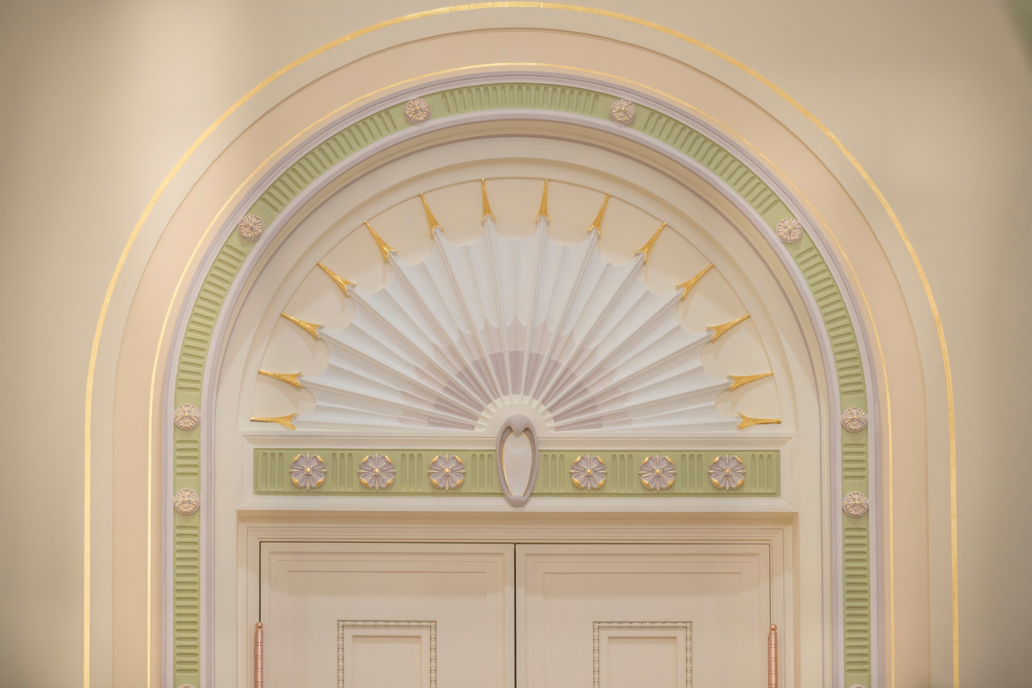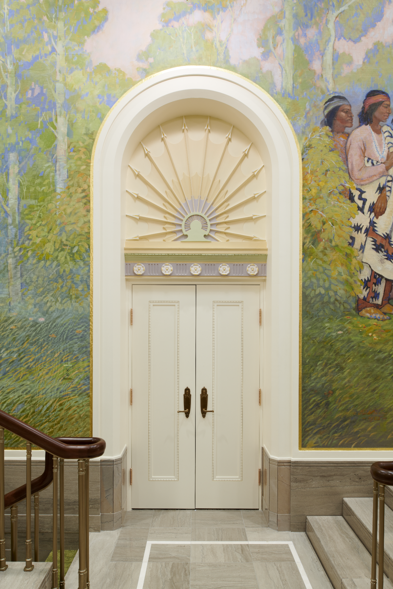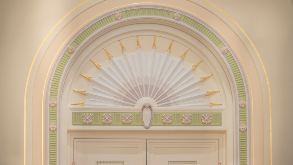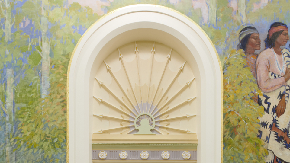 A detailed arched door casing in the upper grand hall of the Mesa Arizona Temple shows off the Colonial Revival style, popular in 1920s America, that includes fluting, rosettes, and egg and dart motifs, May 2021.2021 by Intellectual Reserve, Inc. All rights reserved.Important works of art have been preserved and restored. These include murals in the grand hall depicting Joseph and Hyrum Smith sharing the gospel of Jesus Christ with the Native American nations. Another mural shows John the Baptist giving Joseph and Hyrum the Aaronic Priesthood. Conservators removed layers of paint from years of modifications to the original works, reattached the canvas to the wall and filled in damaged areas.
