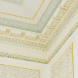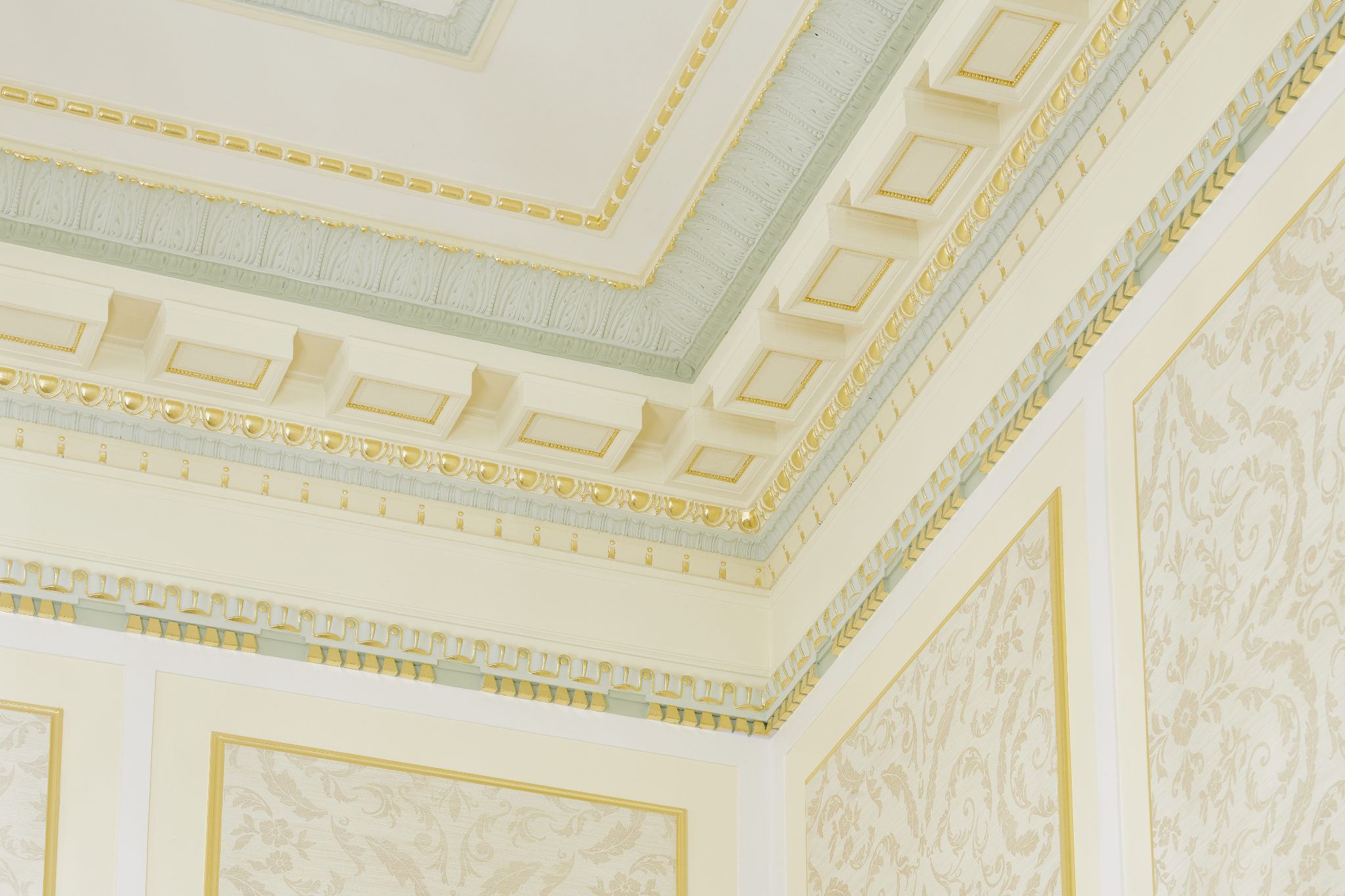 A portion of the ceiling and walls show the ornate décor found in the Mesa Arizona Temple. Neoclassical cues of egg and dart, flutes, rosettes and urns accented with gold leaf are ever-present in the popular 1920s design, May 2021.2021 by Intellectual Reserve, Inc. All rights reserved.Hanging the new murals was a challenge with the rooms’ radiused corners and chamfered window enclosures. Linda’s team developed innovative ways of installation for a precise and consistent fit.