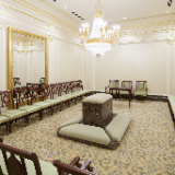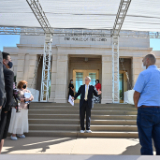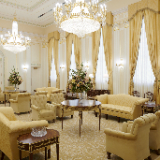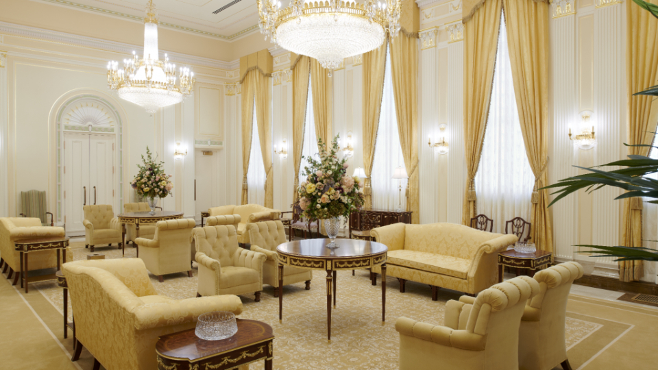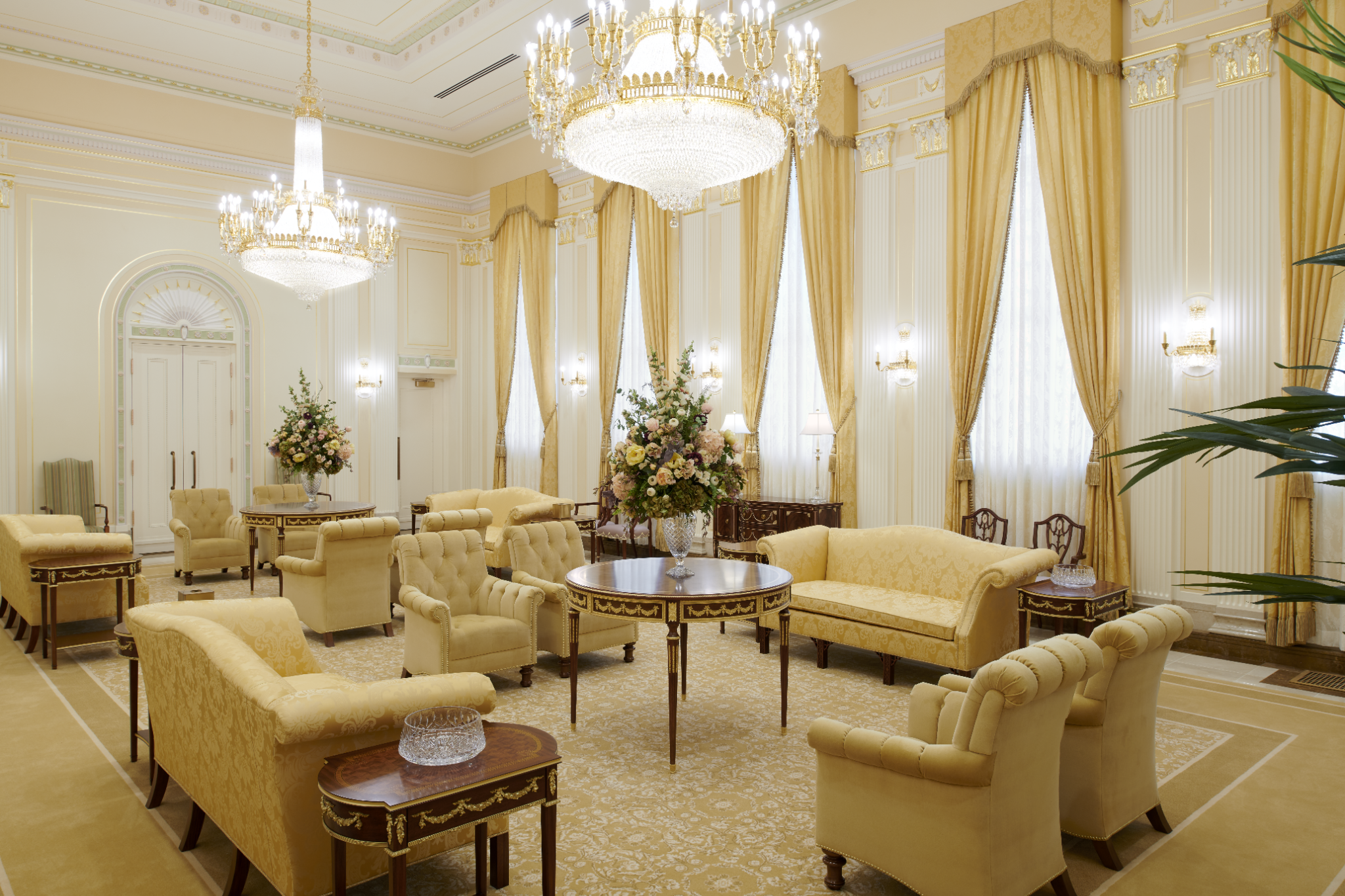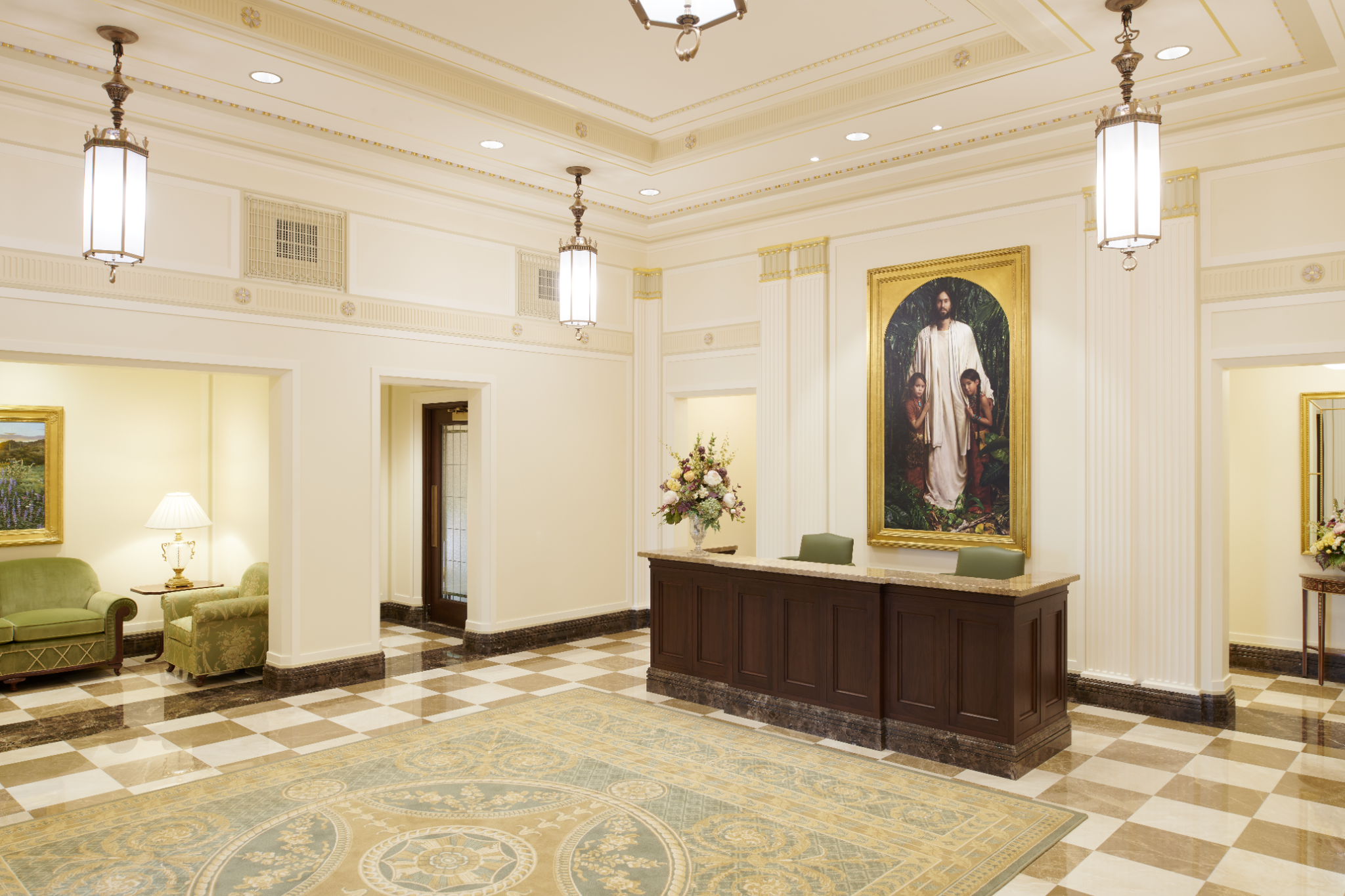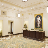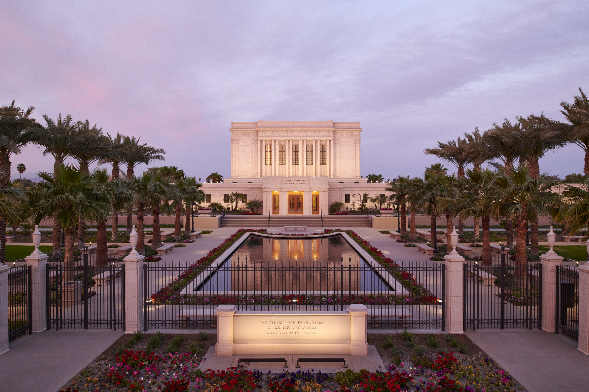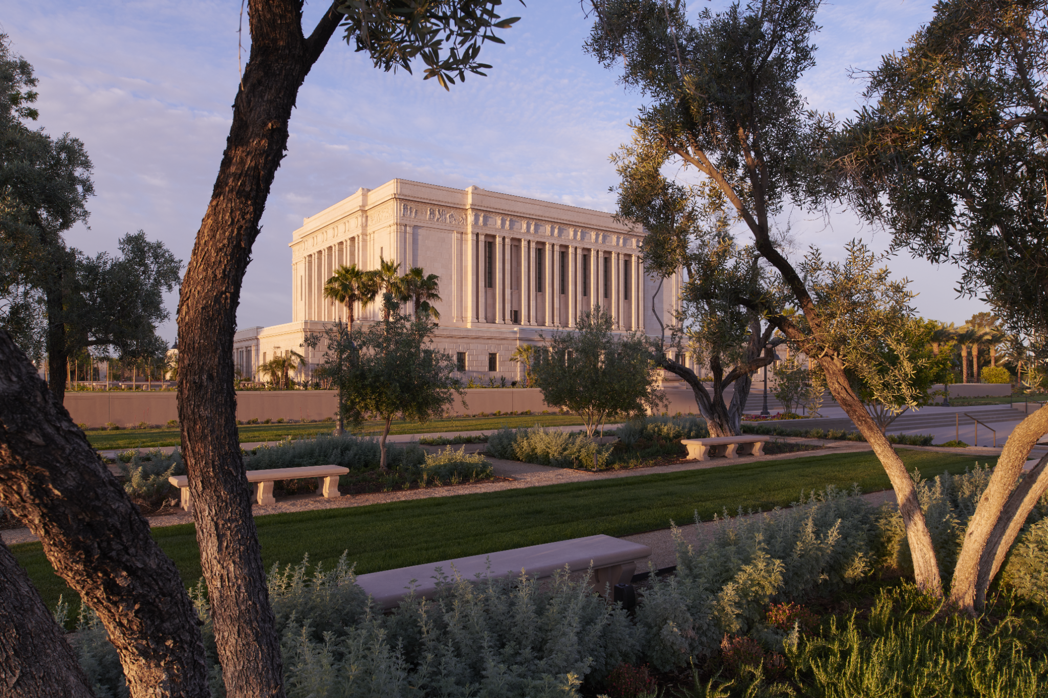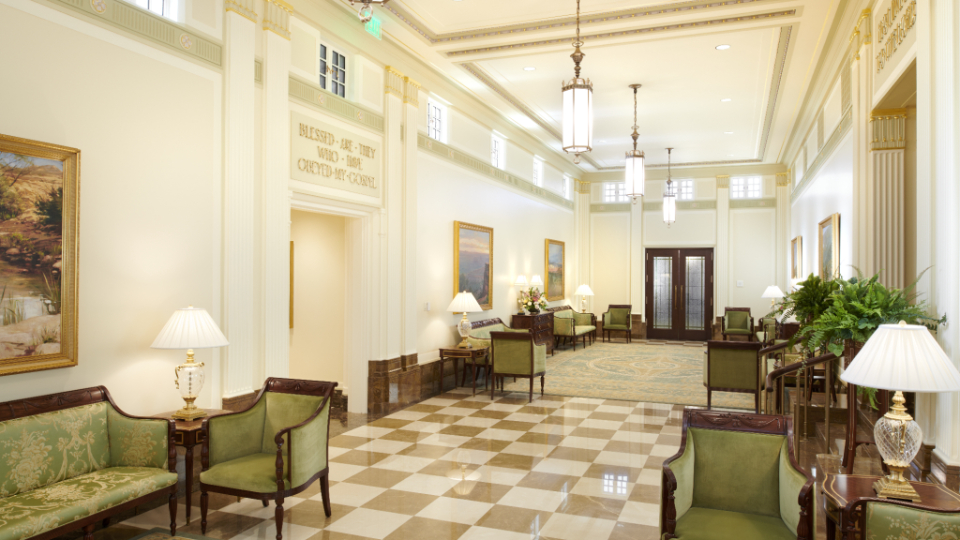 A view of the celestial room of the Mesa Arizona Temple. Lustrous crystalline chandeliers highlight the neoclassical motif with fluted pilasters and Corinthian capitals, which are offset by crystalline sconces. These, combined with exquisite hand-crafted furnishings, are designed to uplift the spirit and inspire the soul. Entering this sacred space represents the ultimate progression one can achieve: into heaven itself, May 2021.2021 by Intellectual Reserve, Inc. All rights reserved.The Mesa Temple renovation improved both the temple exterior and interior. The visitors’ center (completed in August 2021) was relocated to enhance the view of the temple from Main Street. The temple grounds, accessible to anyone, feature an expanded reflection pool and are beautified with more than 300 olive and palm trees, along with other ornamental trees, preserved and relocated with other greenery. A new irrigation system keeps the landscape hydrated by collecting and reusing water.