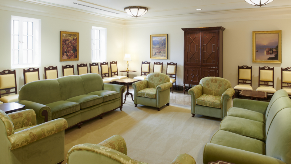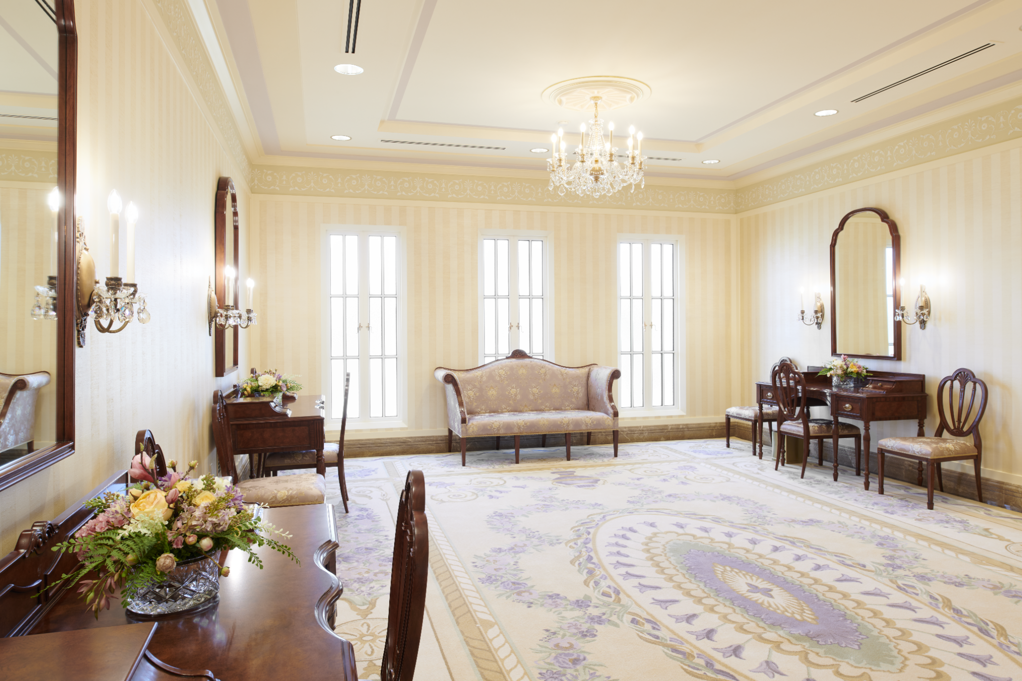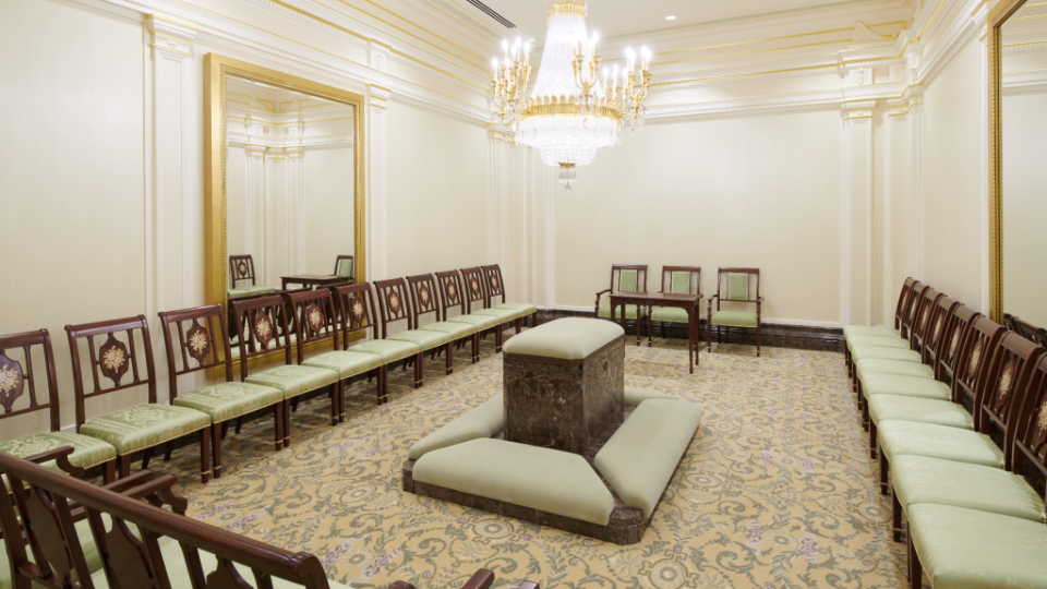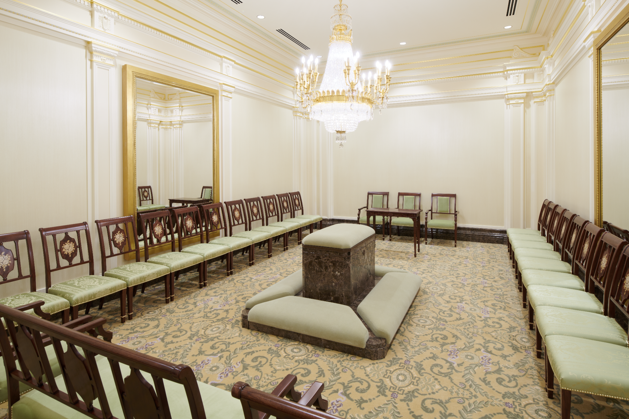 A sealing room in the Mesa Arizona Temple. A replica crystalline chandelier, fluted pilasters and inlaid wood-backed chairs are reminiscent of the Colonial Revival style popular in the 1920s. Here, families are joined together for time and eternity, May 2021.2021 by Intellectual Reserve, Inc. All rights reserved.Expanding worship in the temple to Spanish speakers had ripple effects for the global Church, Utt said.