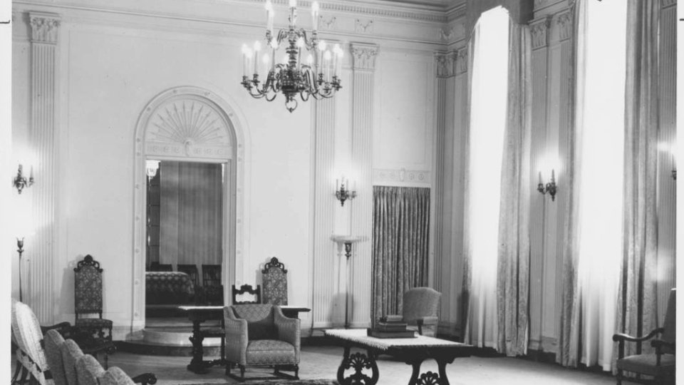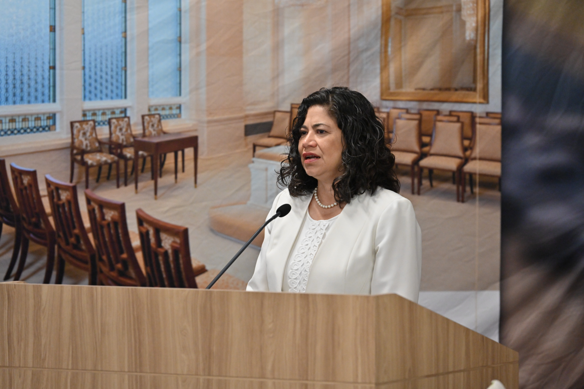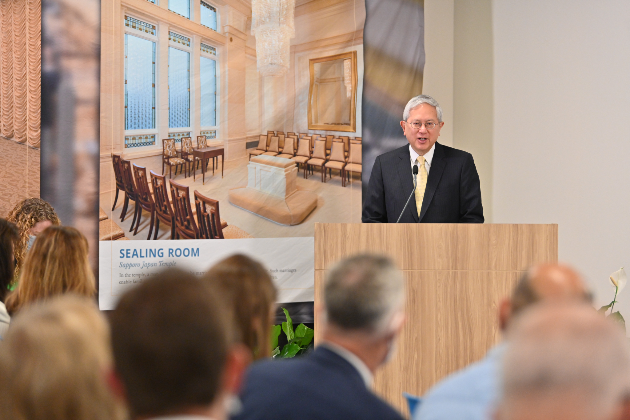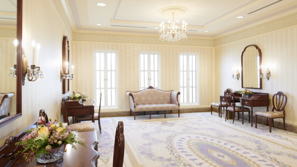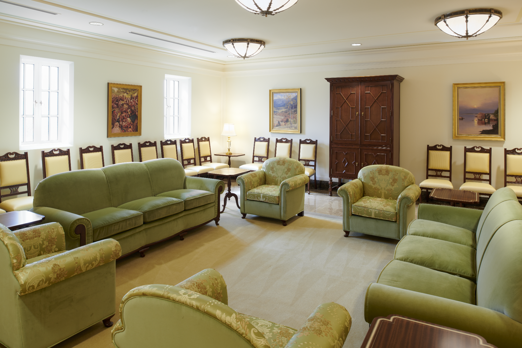 A sealing room in the Mesa Arizona Temple. A replica crystalline chandelier, fluted pilasters and inlaid wood-backed chairs are reminiscent of the Colonial Revival style popular in the 1920s. Here, families are joined together for time and eternity, May 2021.2021 by Intellectual Reserve, Inc. All rights reserved.Expanding worship in the temple to Spanish speakers had ripple effects for the global Church, Utt said.