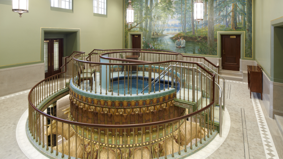 “When you walk in the grand hall today, that’s about as close as we can get to the original without moving sections back around the room,” said Emily Utt, historic sites curator with the Church History Department. “When you look at the mural of John the Baptist ordaining Joseph Smith and Oliver Cowdry to the priesthood, [John] has rays of light coming from him. All of those rays of light had been obscured over the years by other people painting over them. And so the mural conservators came in. They removed those elements. And J. Leo Fairbanks’ original John the Baptist is back in his full glory in this temple.”