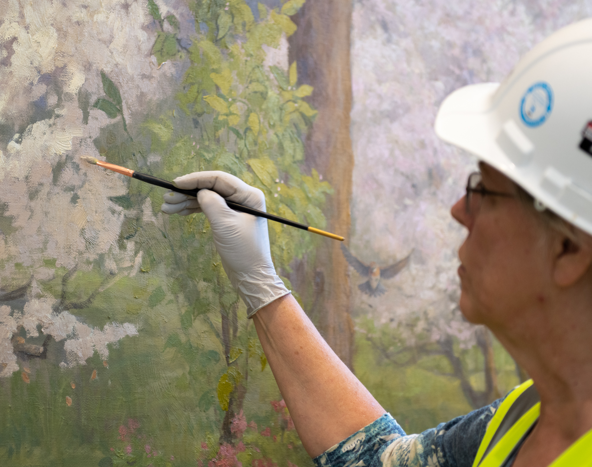 “There’s only one time you put up that canvas. That’s it,” said Linda’s husband, Gregory Lynn Christensen, supervisor of the mural installation. “And if you make a mistake, you have to live with it. And so we have to do it exactly right every time. It was just a huge, huge challenge. After it’s been painted and blended together, it looks like one piece of canvas that covers the entire wall. But it’s really 48 pieces.”
