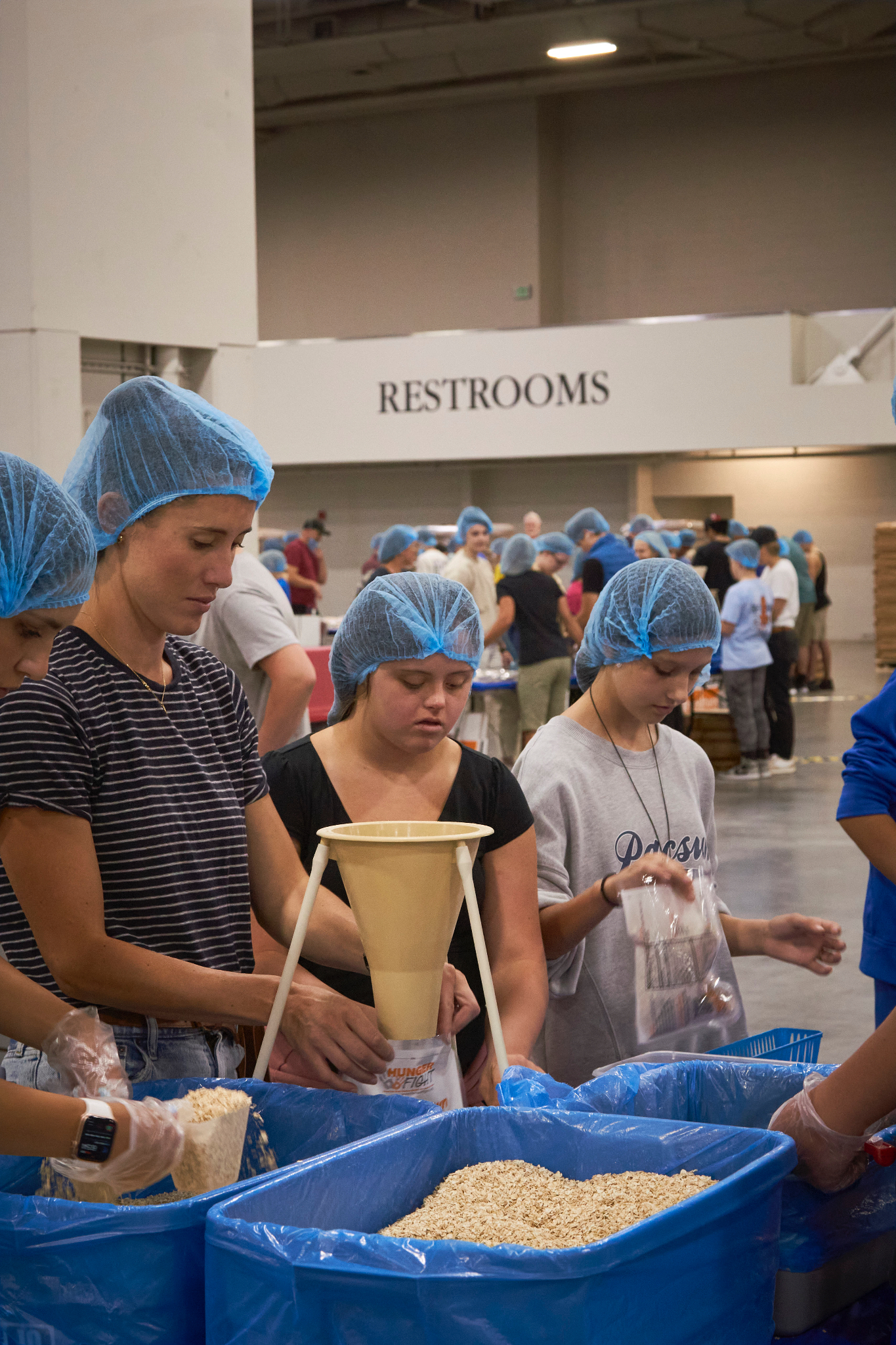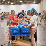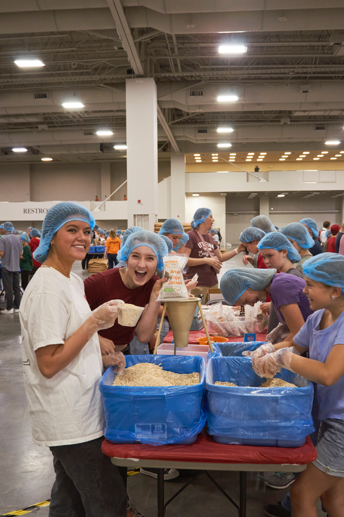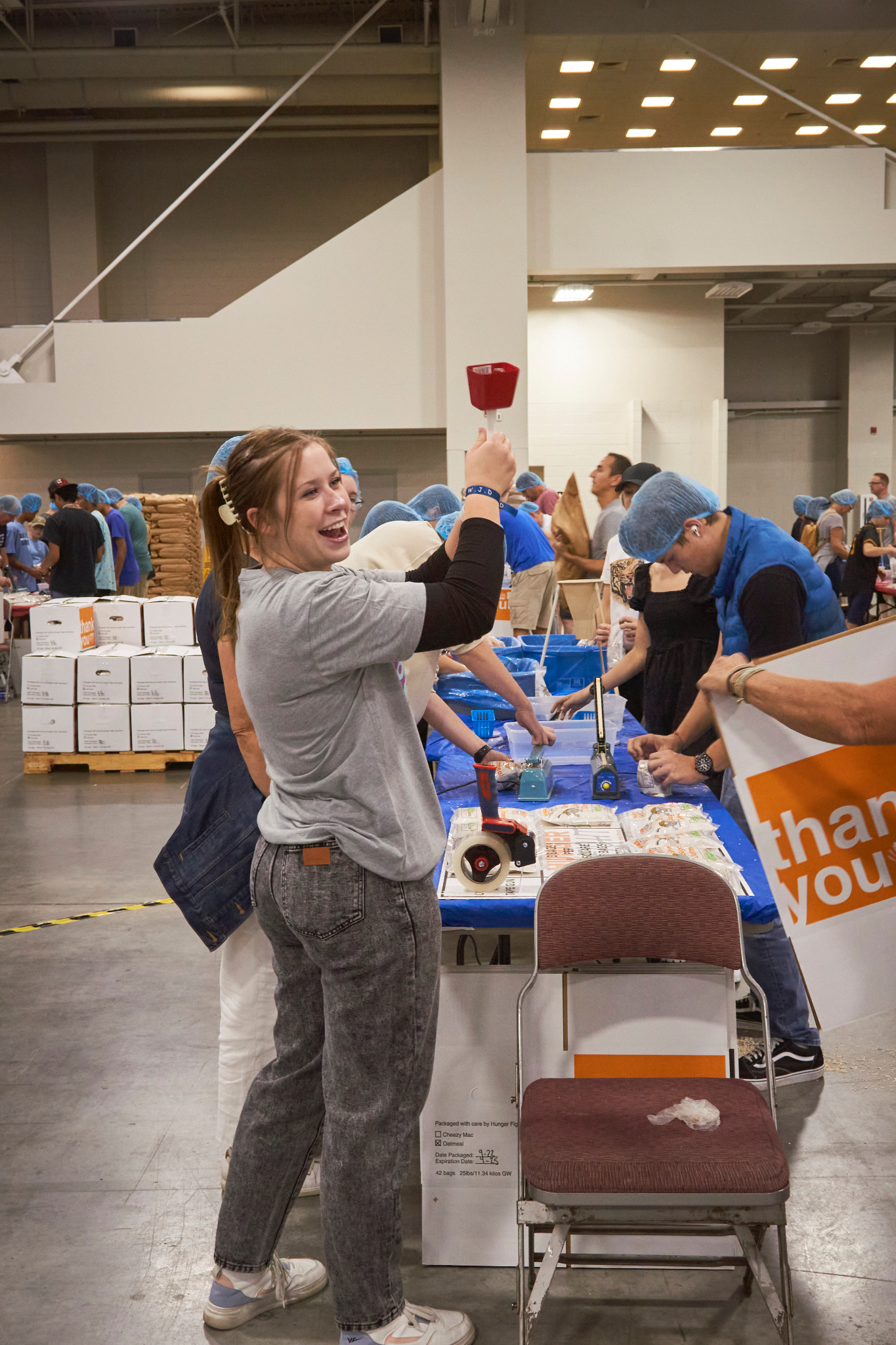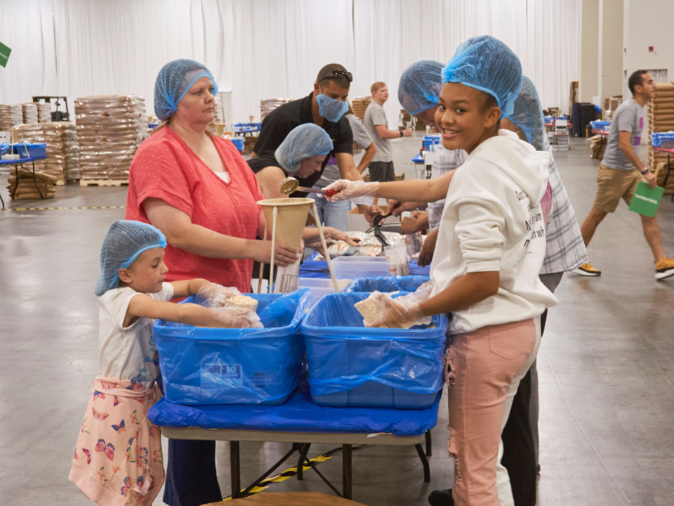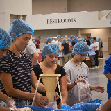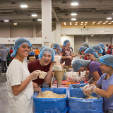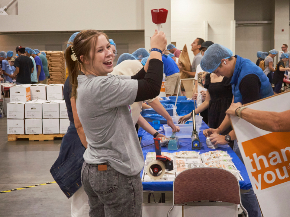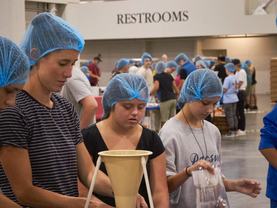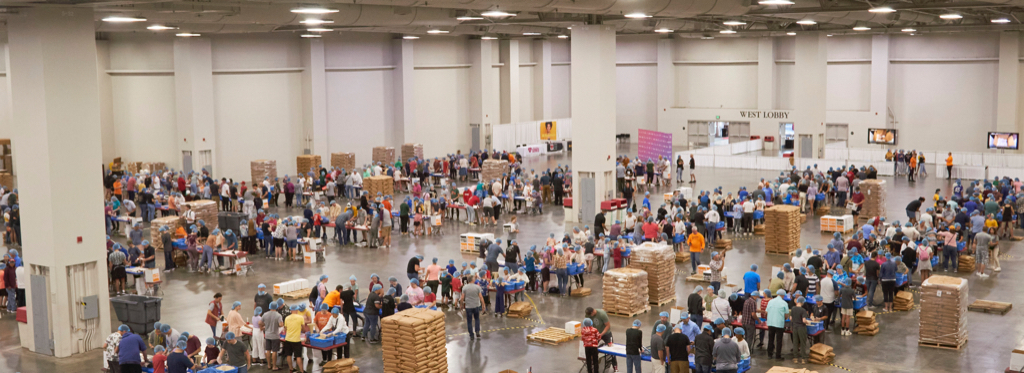 Dozens of tables, each sporting at least eight volunteers clad in hairnets and gloves, filled the huge convention center’s main room. A DJ performed throughout the evening, occasionally stopping to announce the number of meals that had been prepped, which would always induce a huge cheer from the crowd.