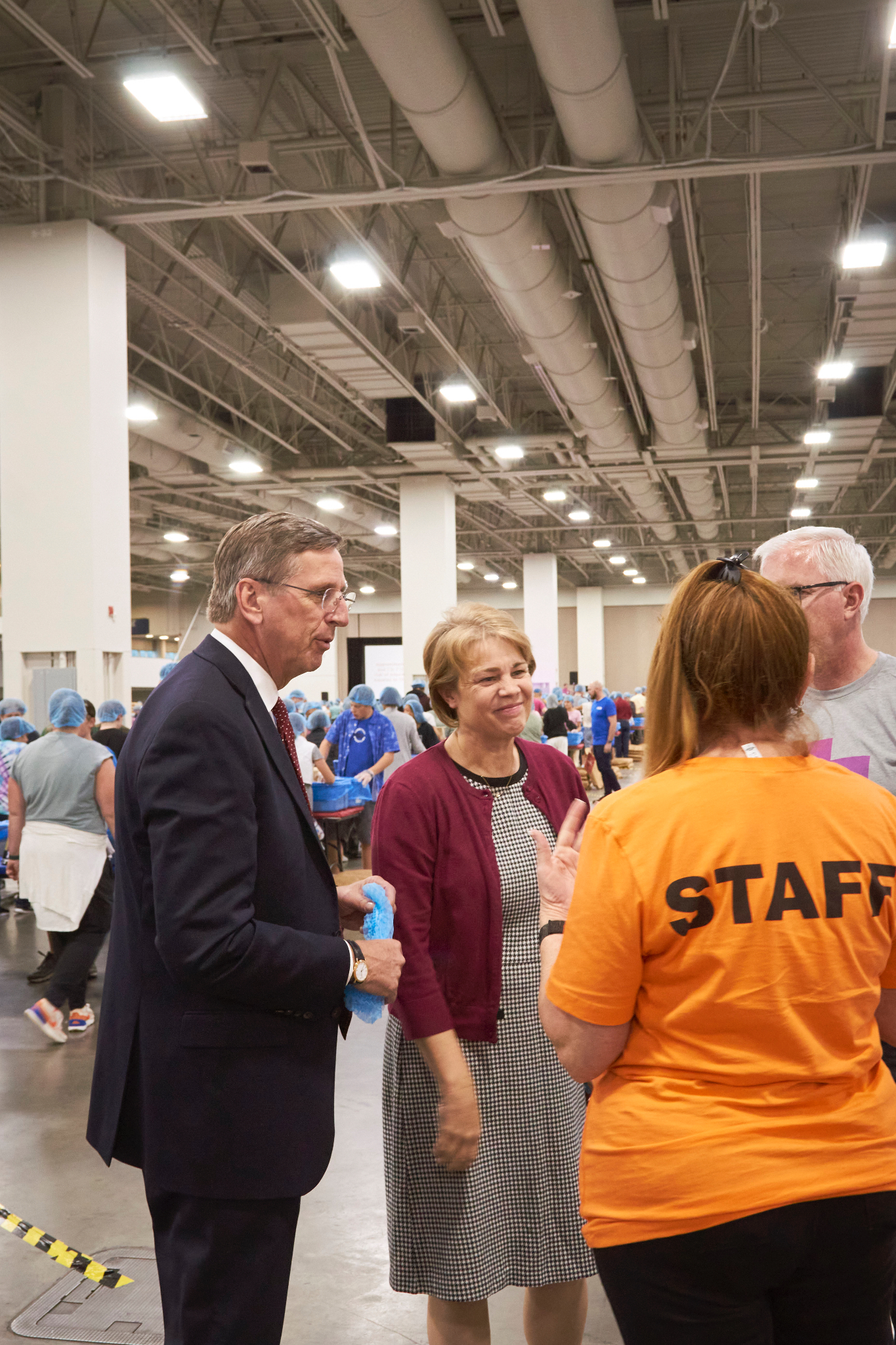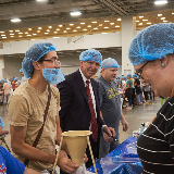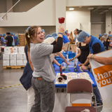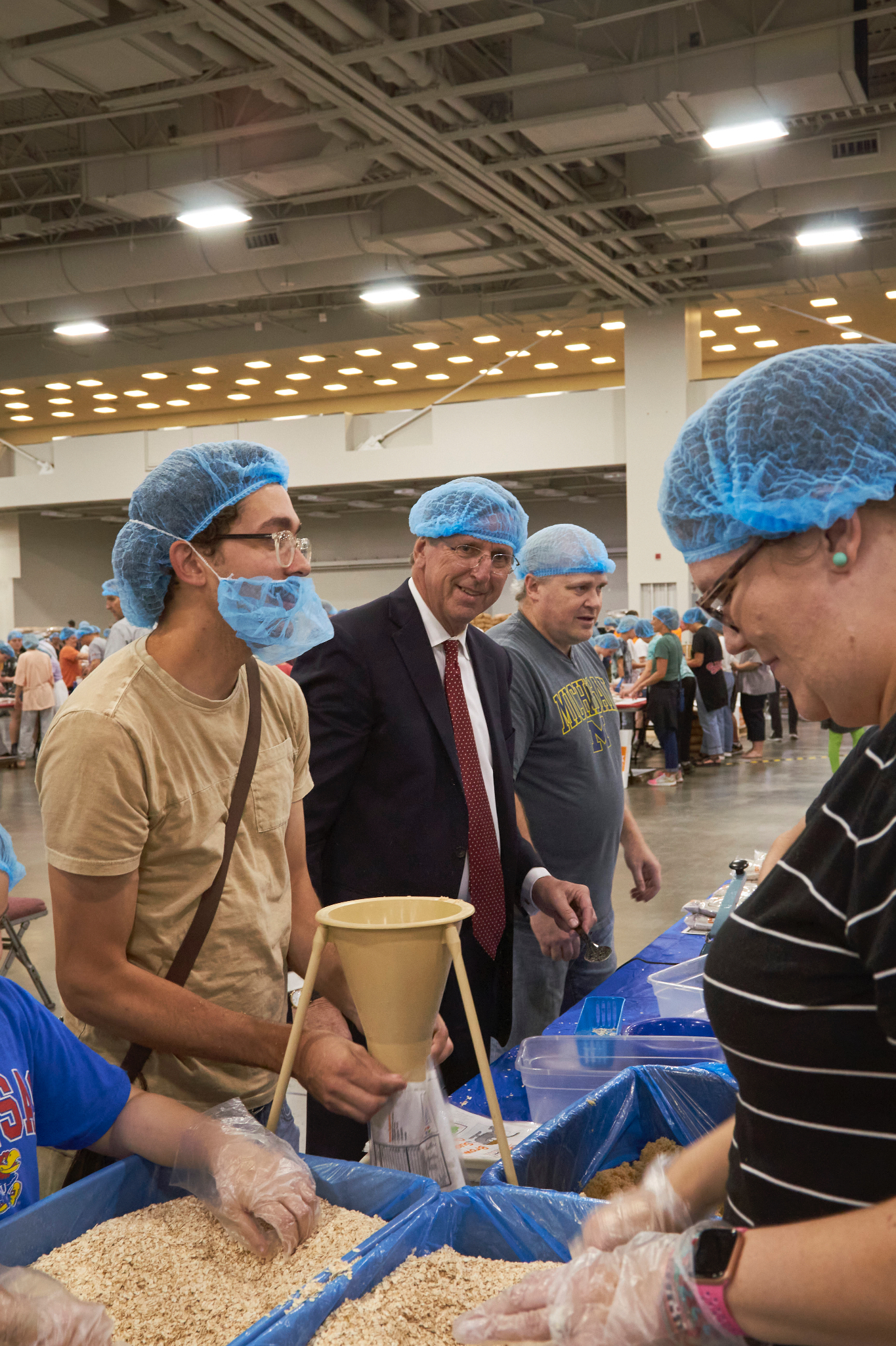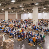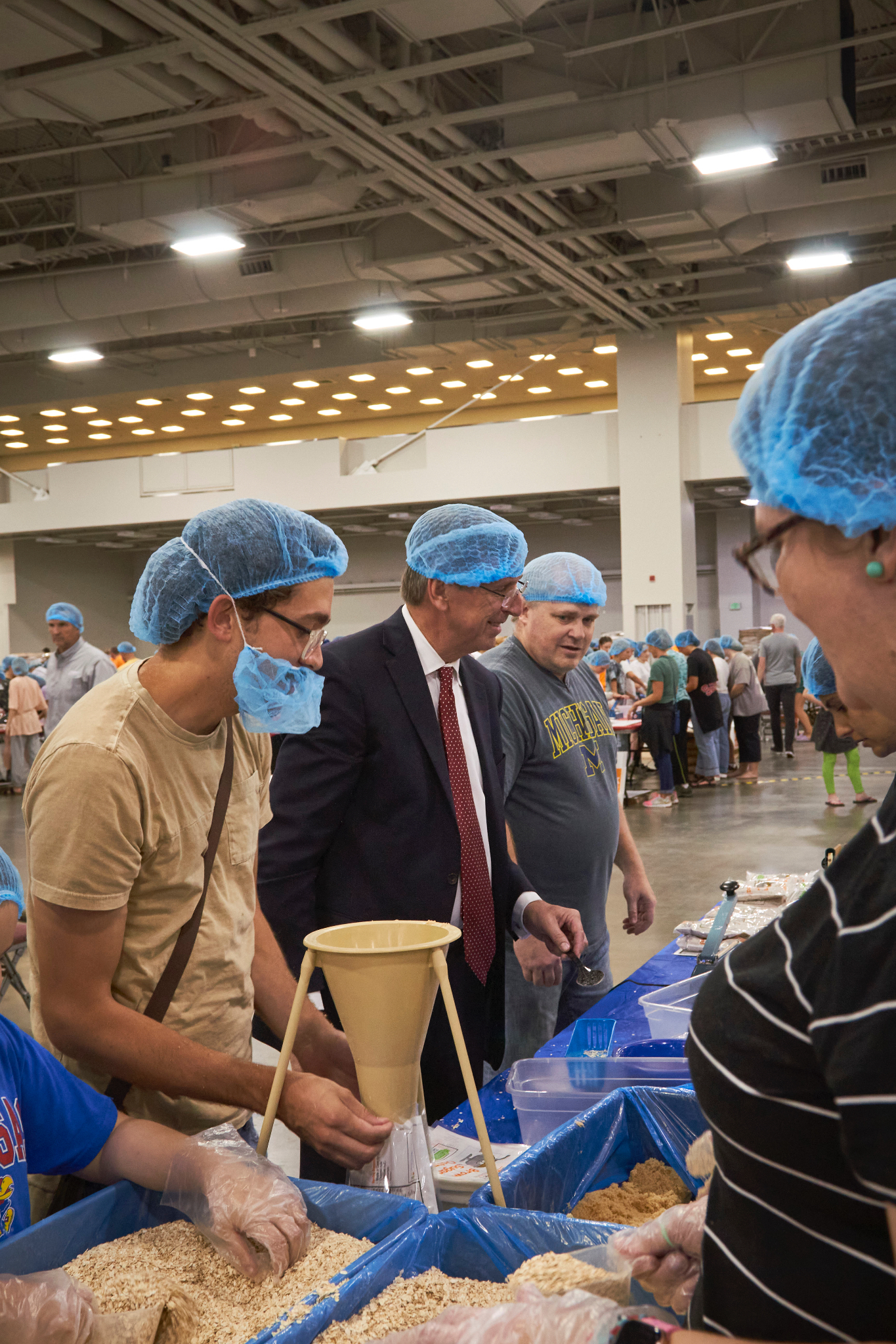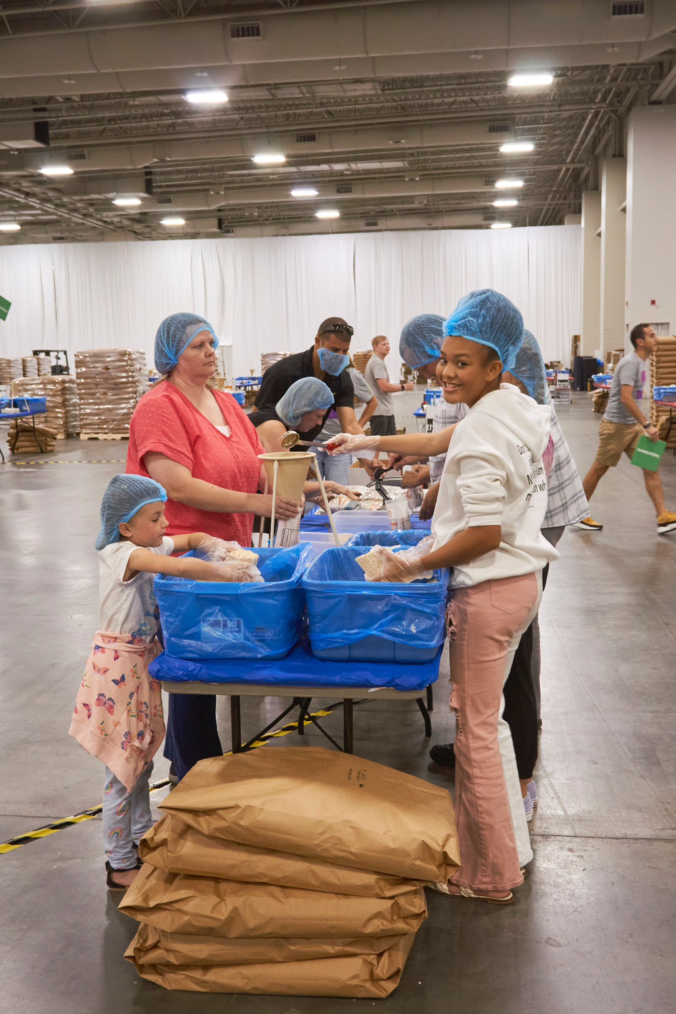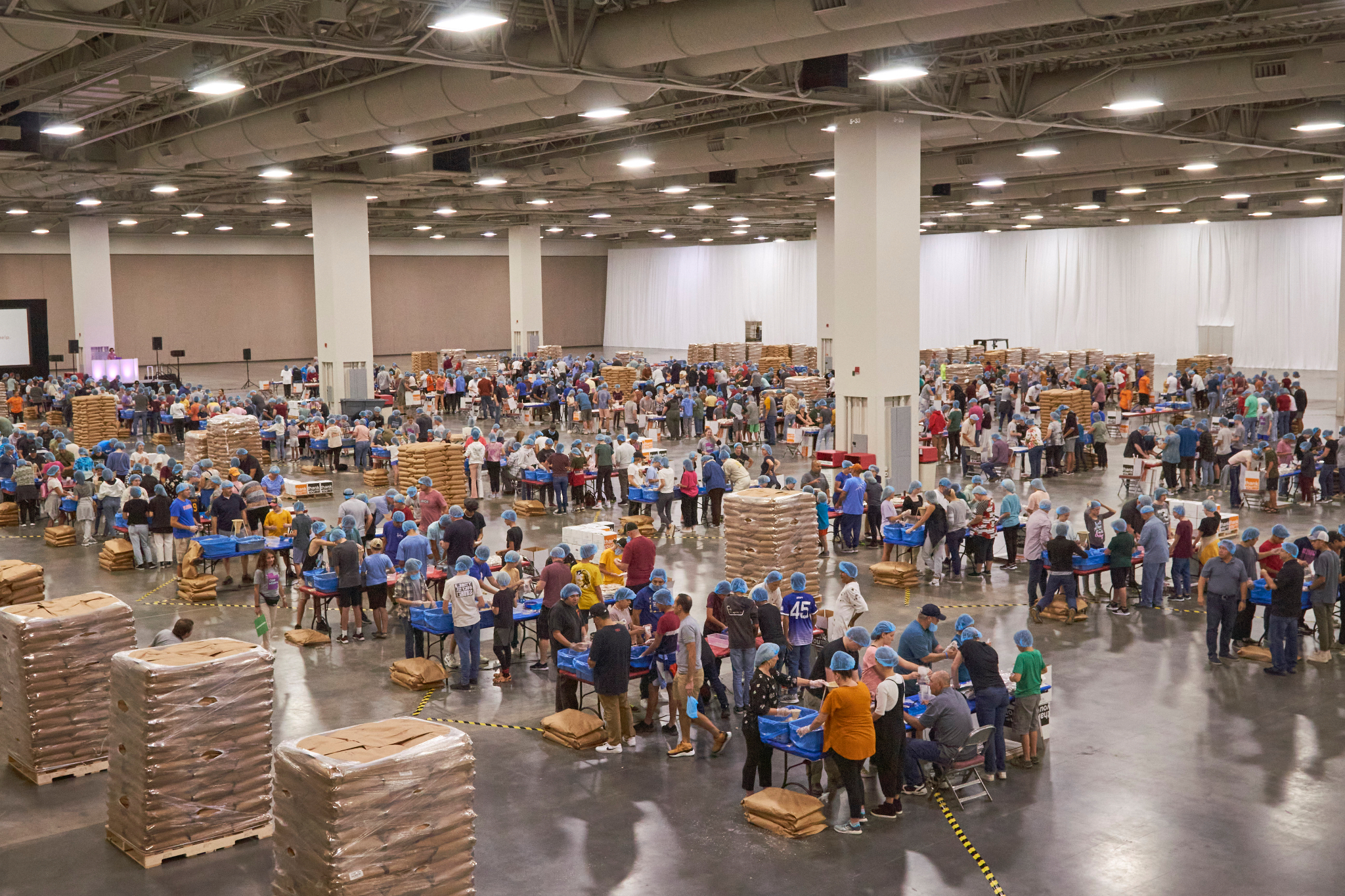Dozens of tables, each sporting at least eight volunteers clad in hairnets and gloves, filled the huge convention center’s main room. A DJ performed throughout the evening, occasionally stopping to announce the number of meals that had been prepped, which would always induce a huge cheer from the crowd.