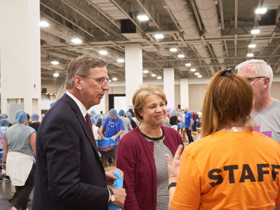 Elder Kevin W. Pearson joins volunteers at the 1 Million Meals service event in the Salt Palace Convention Center in Salt Lake City on September 28, 2022.2022 by Intellectual Reserve, Inc. All rights reserved.Elder Kevin W. Pearson, President of the Church’s Utah Area, and Sister Sharon Eubank, director of Humanitarian Services for the Church of Jesus Christ, were present at the event. They mingled with the youth and even helped package meals.