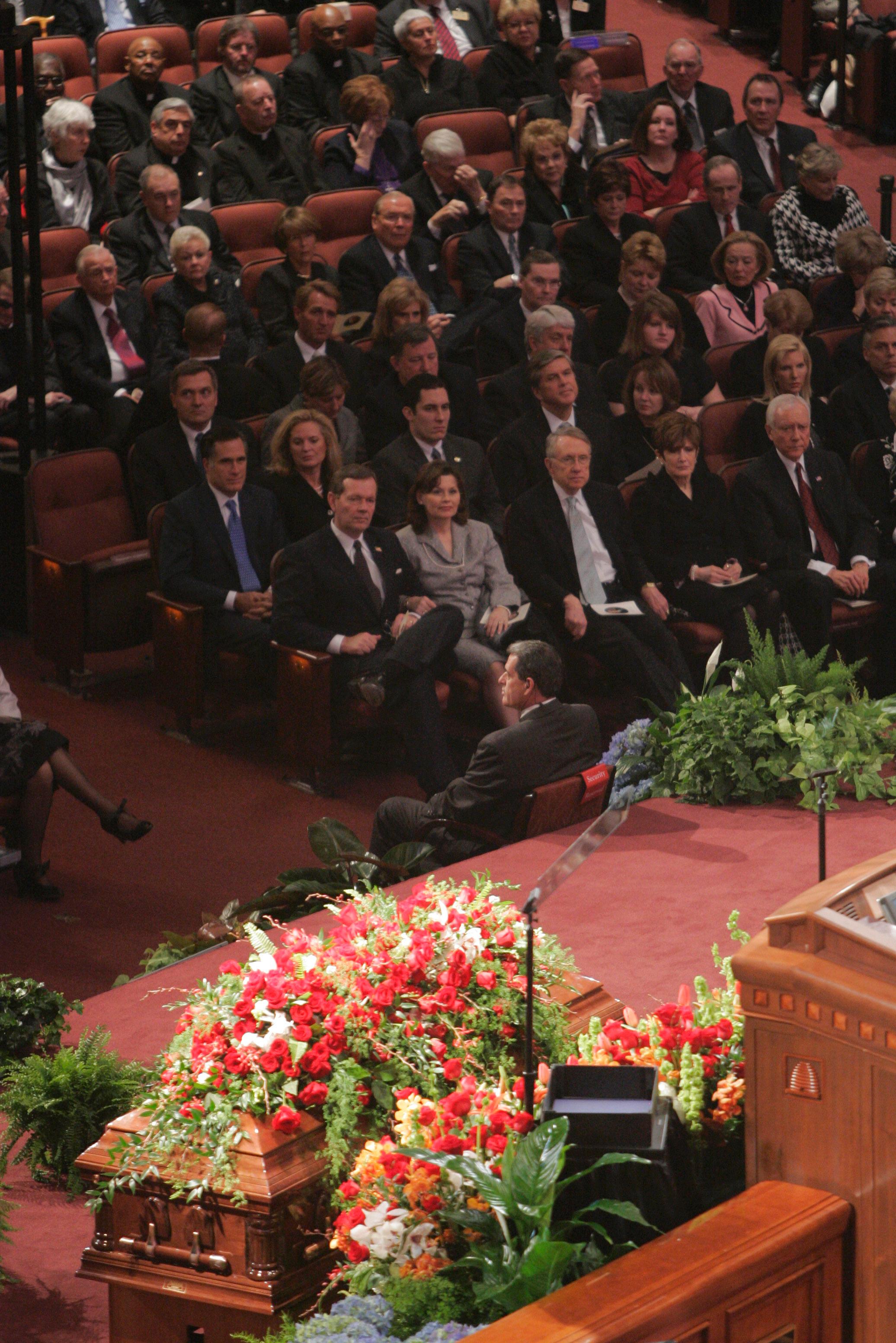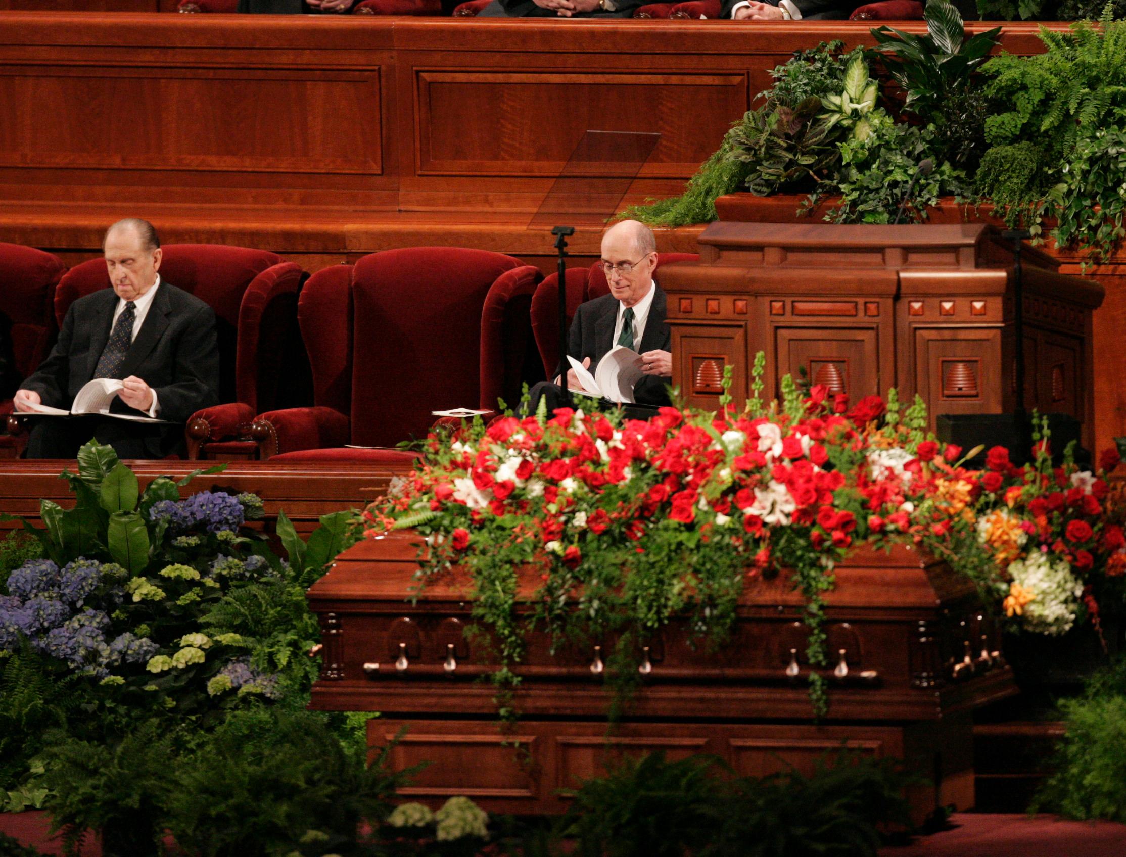 During the service, the Mormon Tabernacle Choir sang four hymns, two of which, “My Redeemer Lives,” and “What Is This Thing That Men Call Death” were written by President Hinckley. The hymns spoke of trust in God, the importance of example, optimism and hope - all central themes in his life.