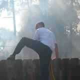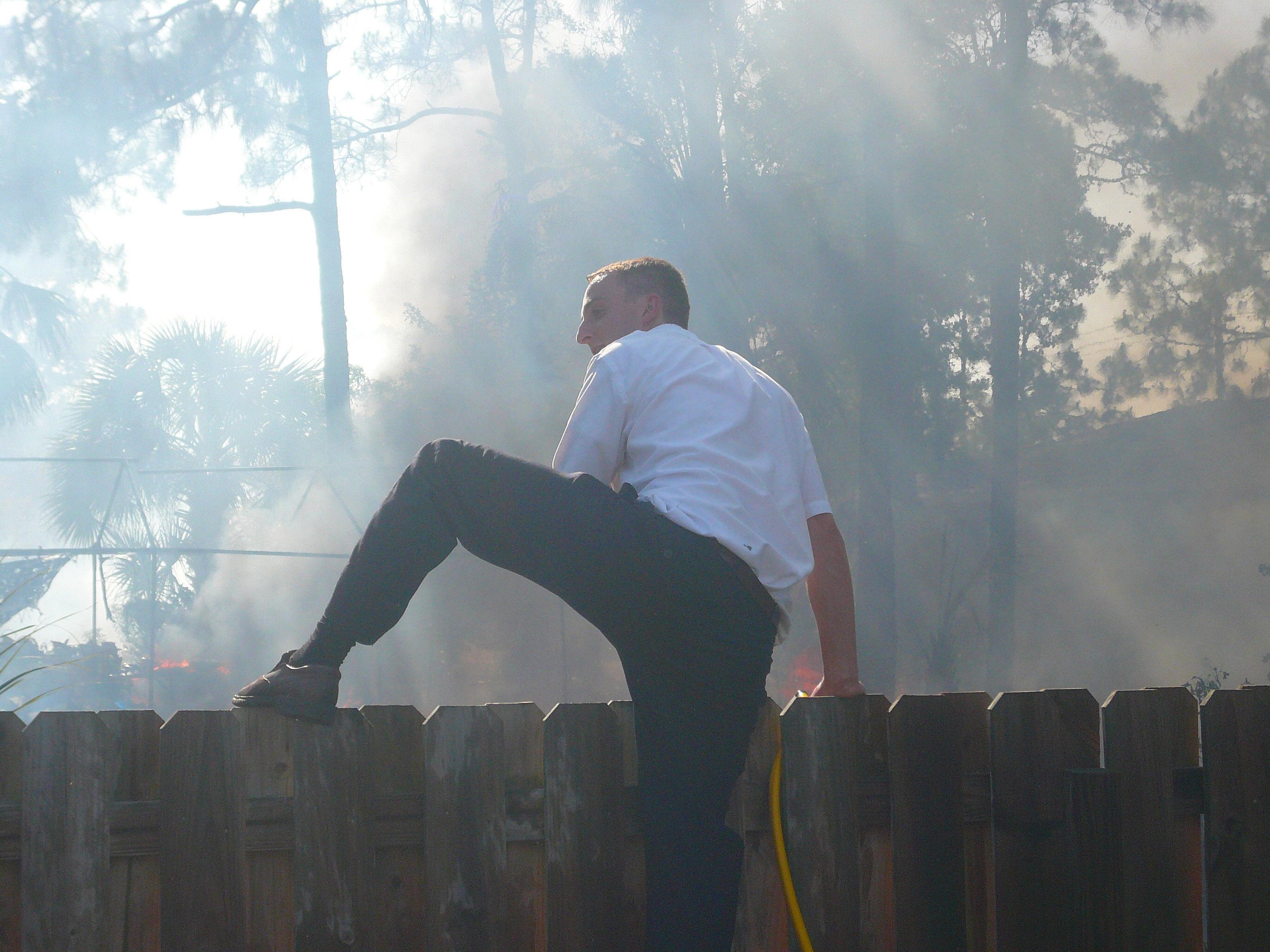 The missionaries shoveled dirt and sprayed water from garden hoses to help control fires. After two hours beating back flames, they were able to help save the homes of neighbors Brandy LaDawn and Paul Budhu.