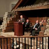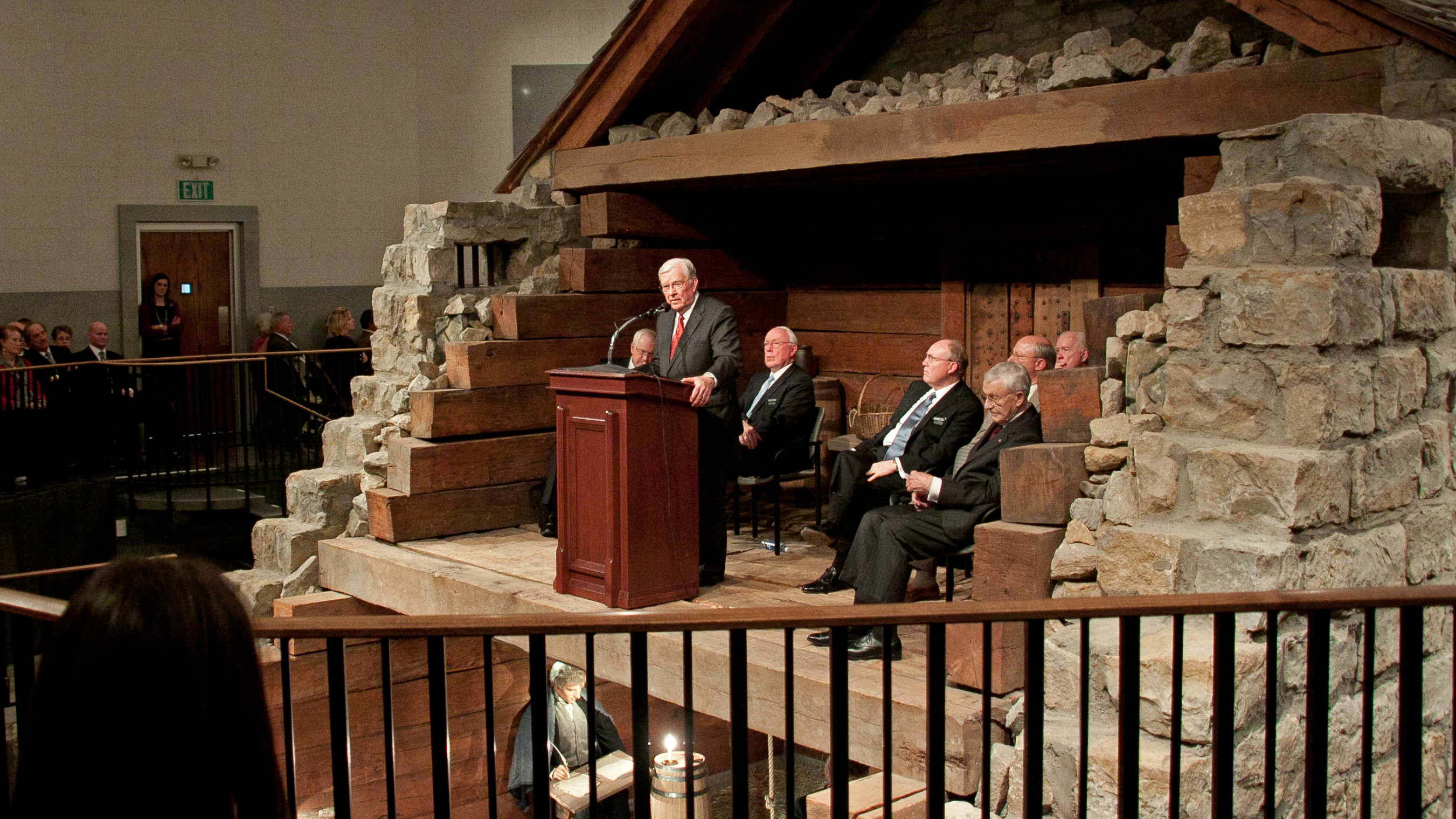 Elder Ballard speaks from a podium inside the reconstructed Liberty Jail during a commemoration of the historic site's 50th anniversary.
