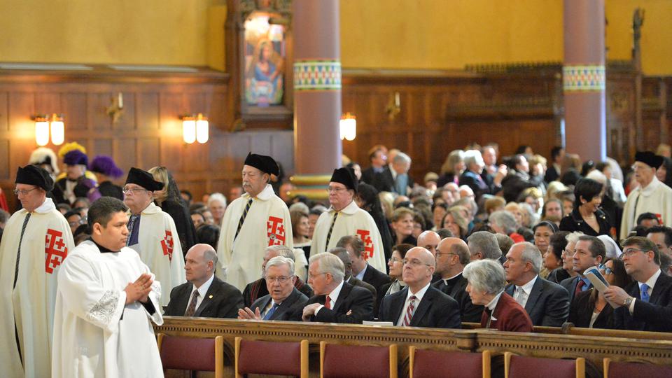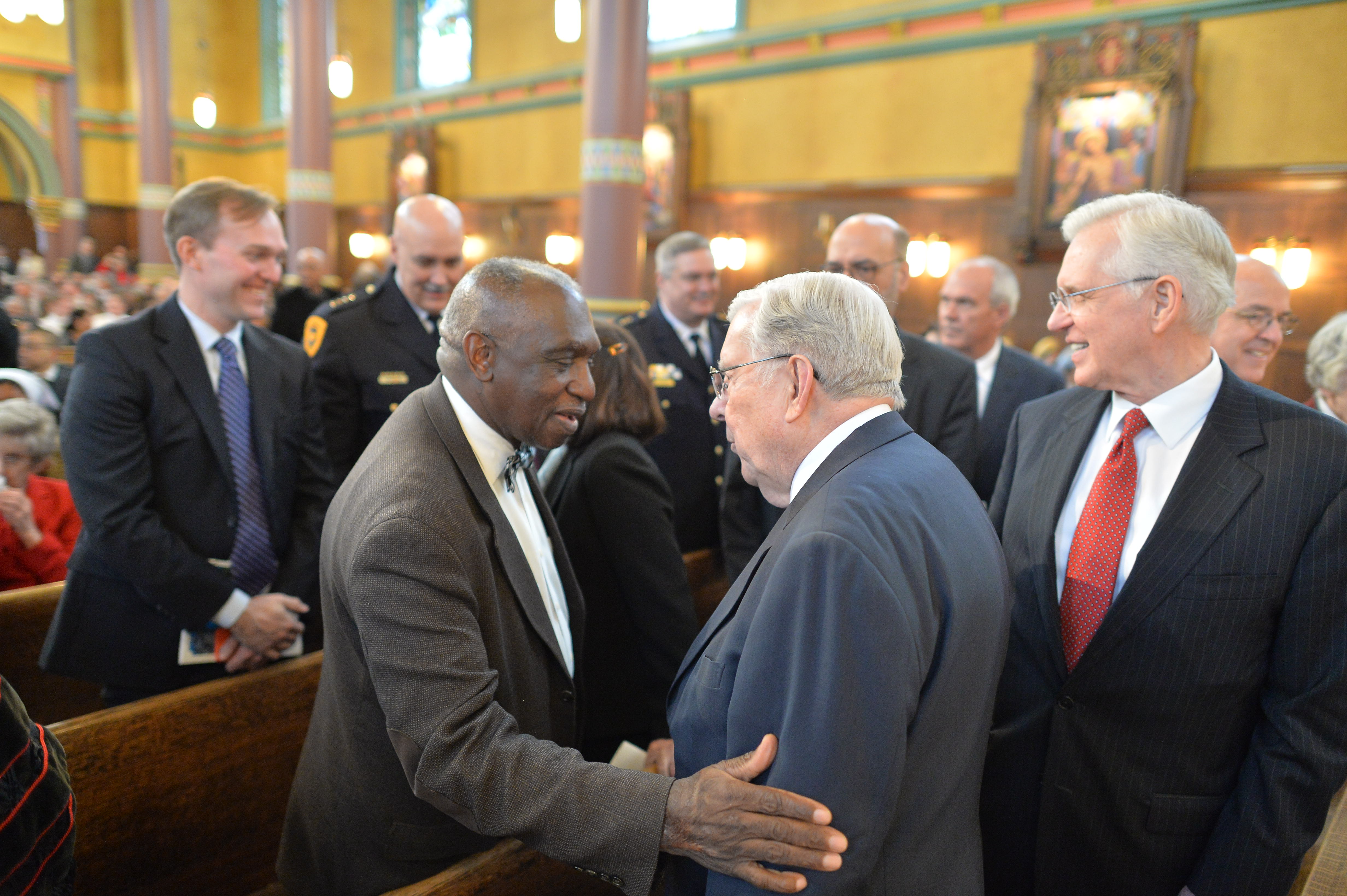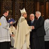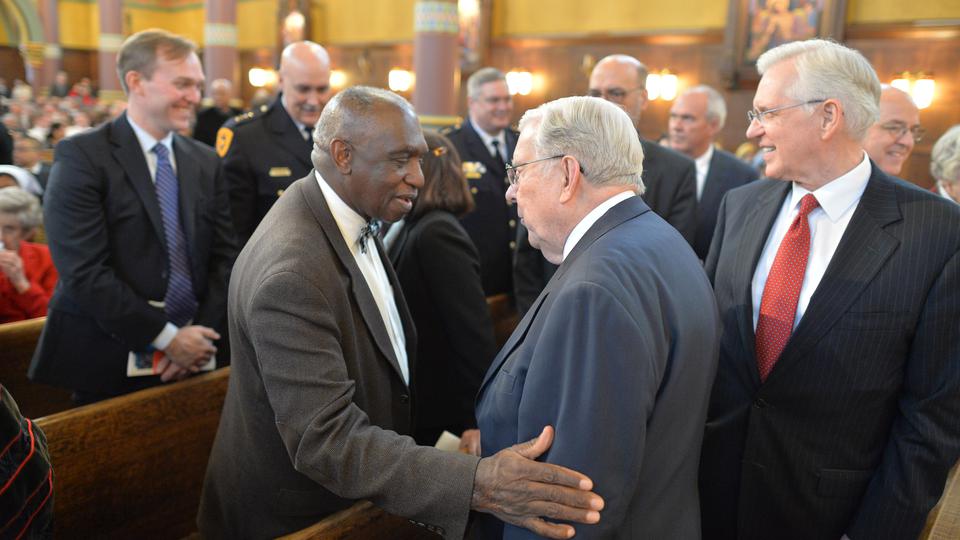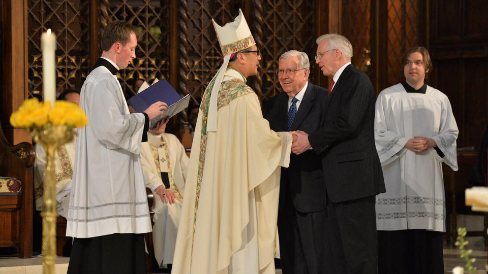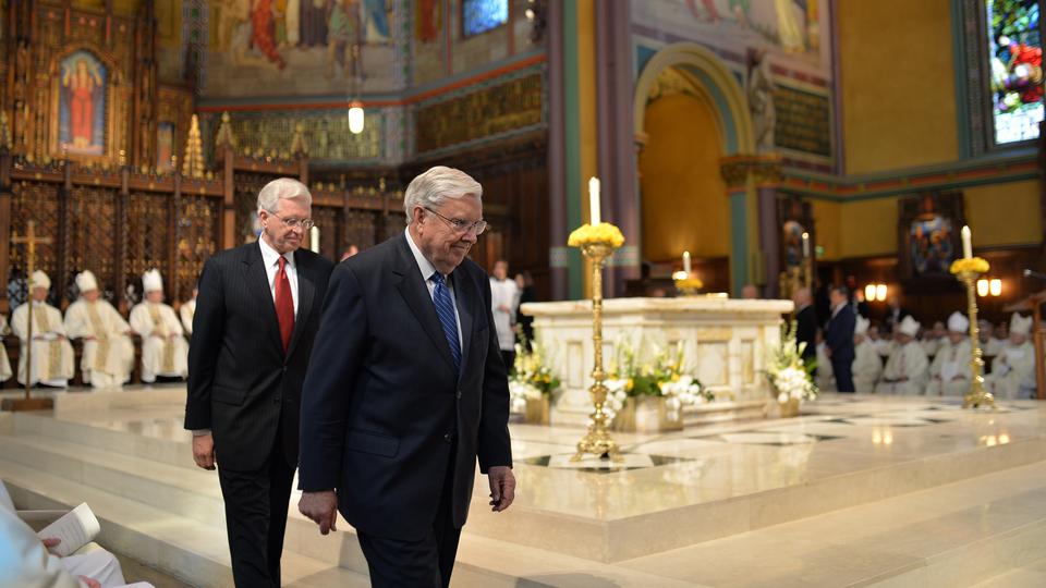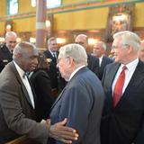 Elder M. Russell Ballard and Elder D. Todd Christofferson of the Quorum of the Twelve Apostles and Elder L. Whitney Clayton of the Presidency of the Seventy attended the installation ceremony for Bishop Solis on Tuesday afternoon, March 7, 2017, at the Cathedral of the Madeleine.