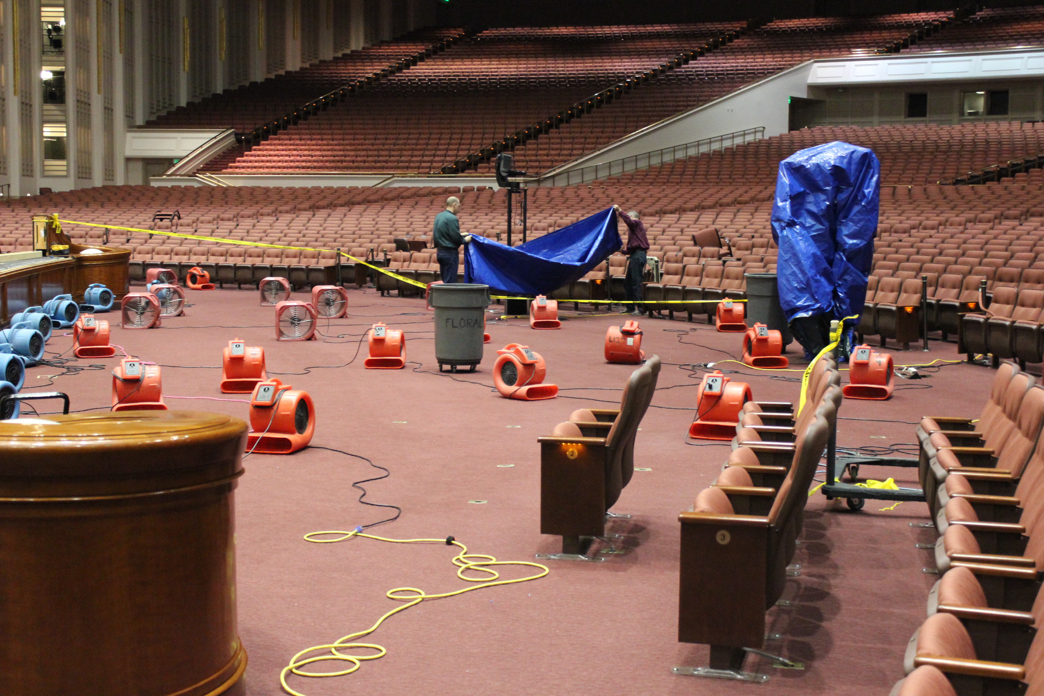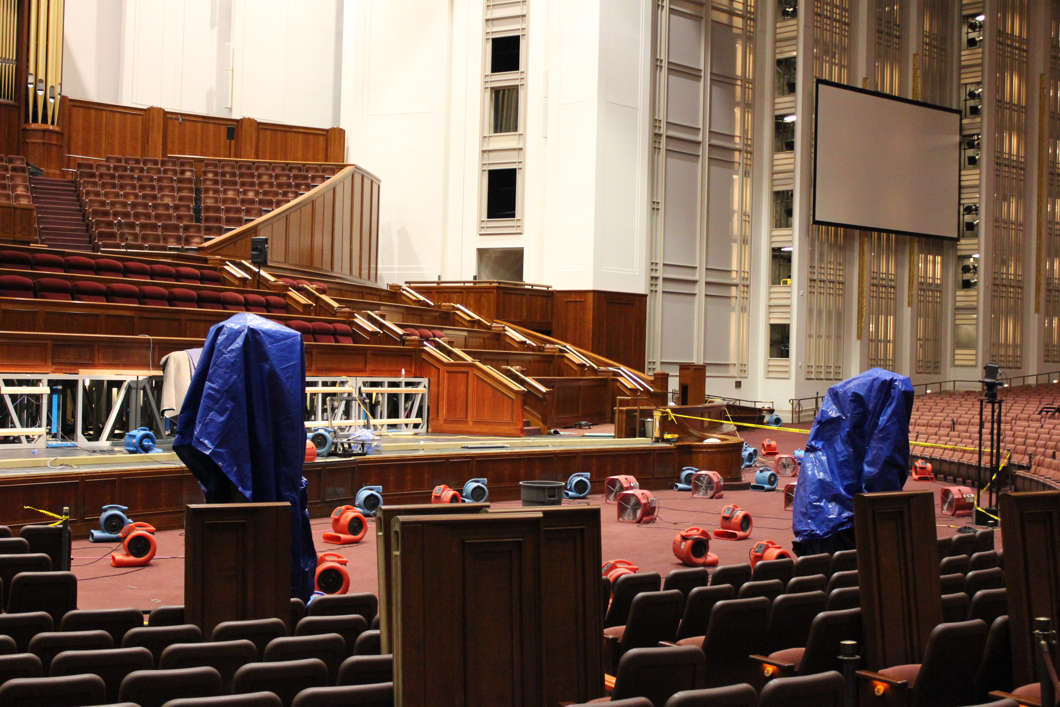 The fire at the Church Conference Center was limited to a backup power supply cabinet in an electrical control room above the main auditorium. Two sprinkler heads functioned as designed and extinguished the fire. Water overflow to the auditorium floor below was limited to a 50-foot area in front of the podium but did not cause significant damage. Water in the affected area has been extracted, and fans are being used to dry the carpet and chairs. The actual cause of the fire remains under investigation.