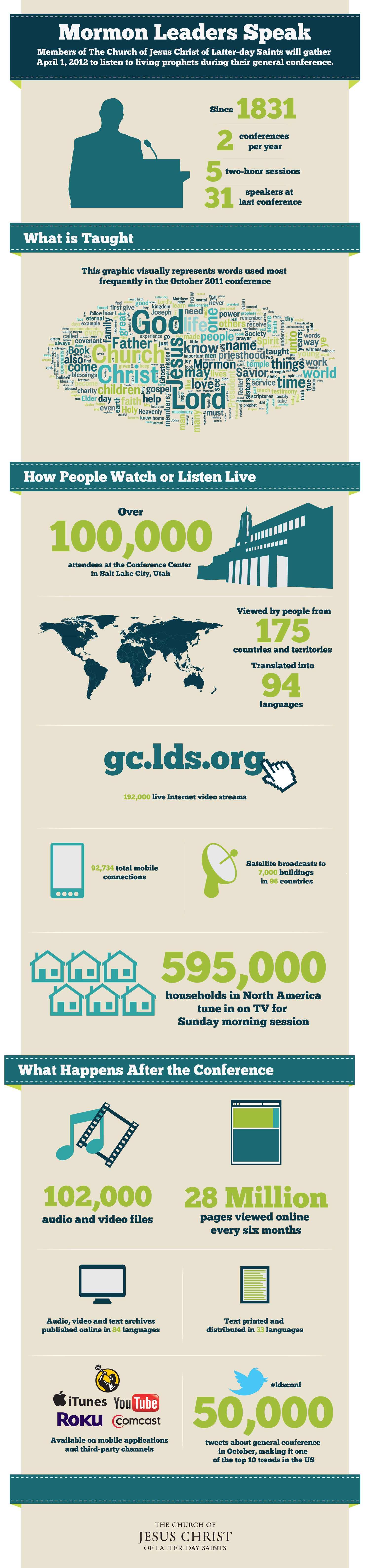Millions of Church members, friends and invited guests are expected to view the 182nd Annual General Conference of The Church of Jesus Christ of Latter-day Saints (Mormon). All five conference proceedings will be held Saturday and Sunday, 31 March and 1 April 2012, in the Conference Center in Salt Lake City and can also be viewed live via television, radio, satellite and Internet broadcasts.
