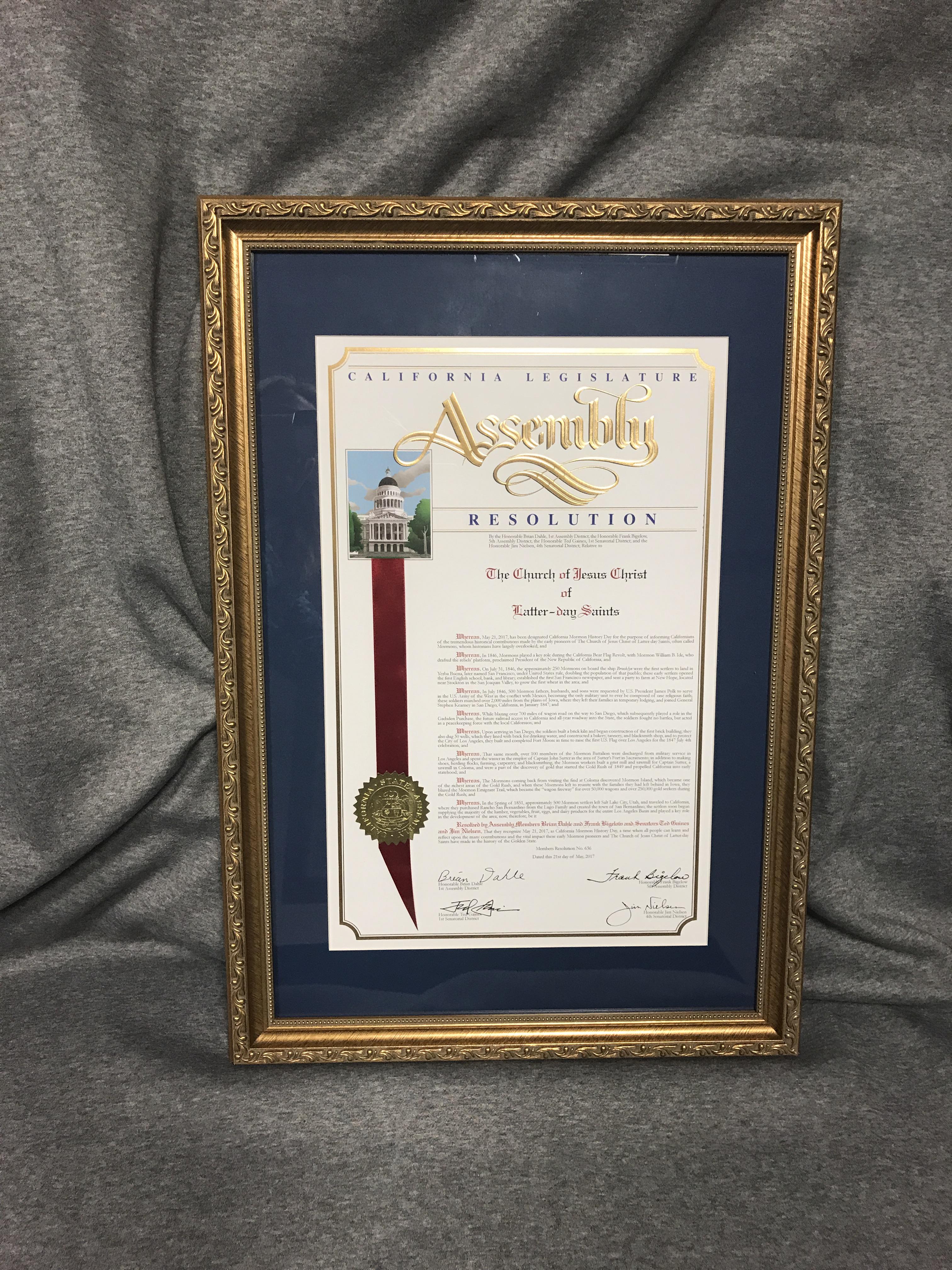 The California State Legislature declared Sunday, May 21, 2017, California Mormon History Day “for the purpose of informing Californians of the tremendous historical contributions made by the early pioneers of The Church of Jesus Christ of Latter-day Saints,” stated the resolution.