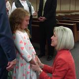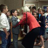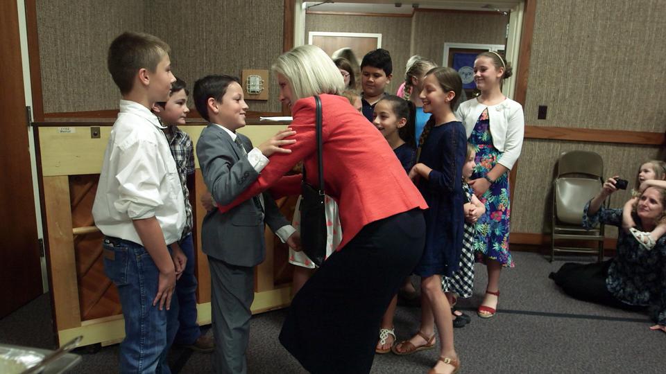 After the meeting, Elder and Sister Rasband shook hands with congregation members who stood in a line to meet them before dinner was served in the meetinghouse. The Primary children also sang a song to Sister Jones during her visit to Loma Rica.