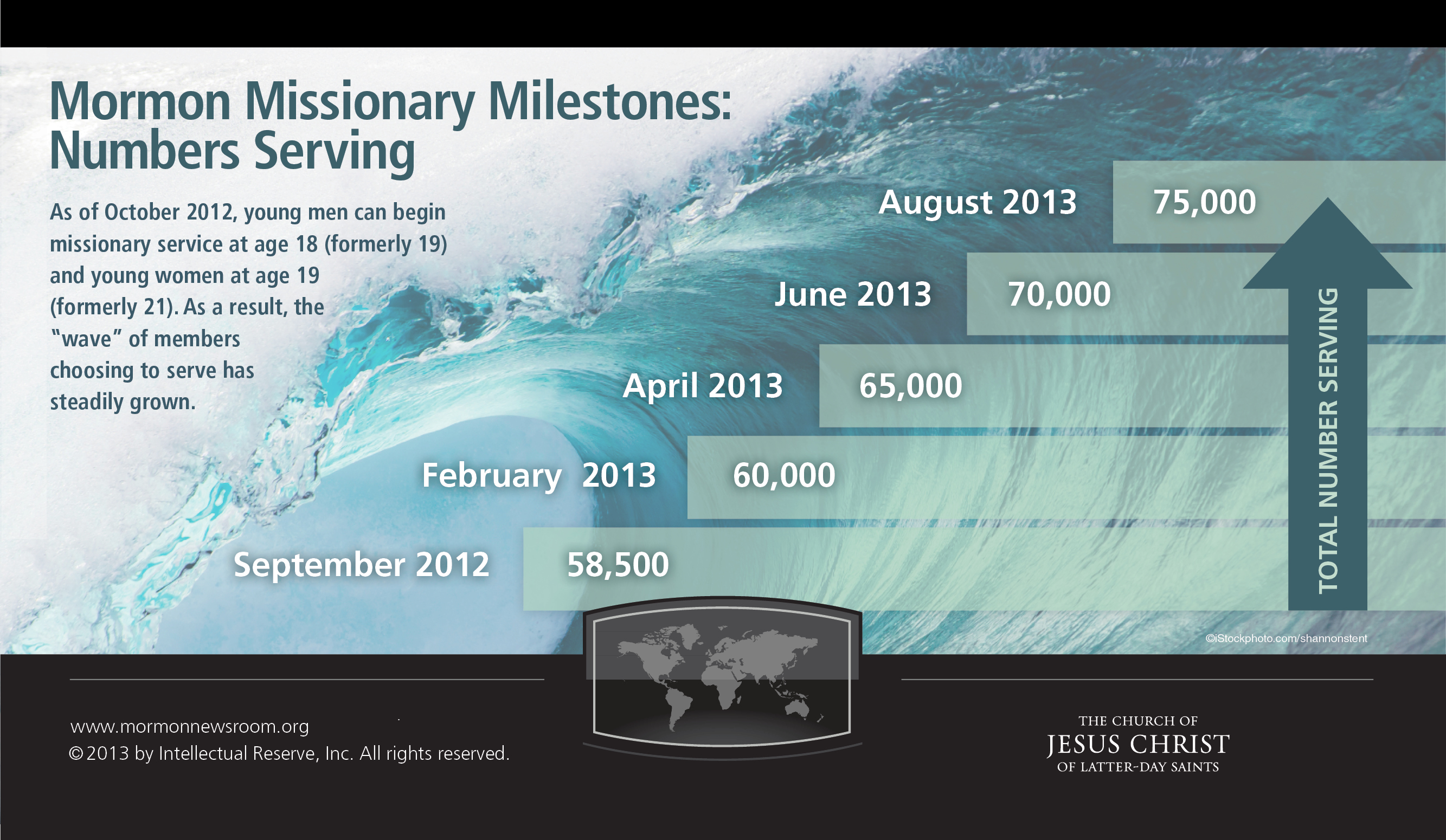 Since the October 2012 announcement that men can begin Mormon missionary service at age 18 and women at 19, the ranks of Mormon missionaries have swelled. Prior to the announcement, 58,500 missionaries were serving; as of this week, that number is now 75,000.