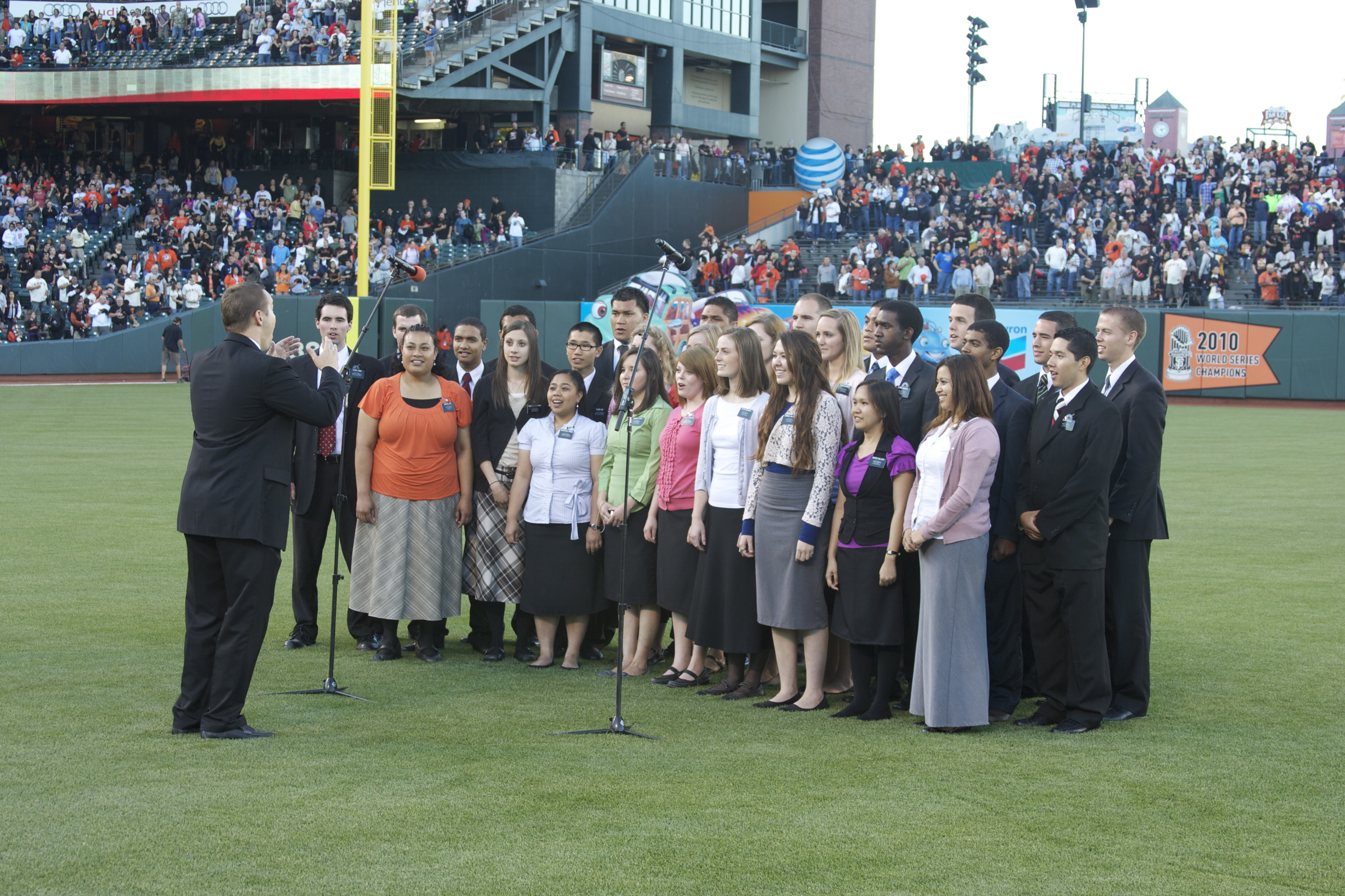 In addition to the pre-game ceremonies, more than a dozen Latter-day Saint missionaries assigned to the Bay Area sang the national anthem prior to the first pitch.