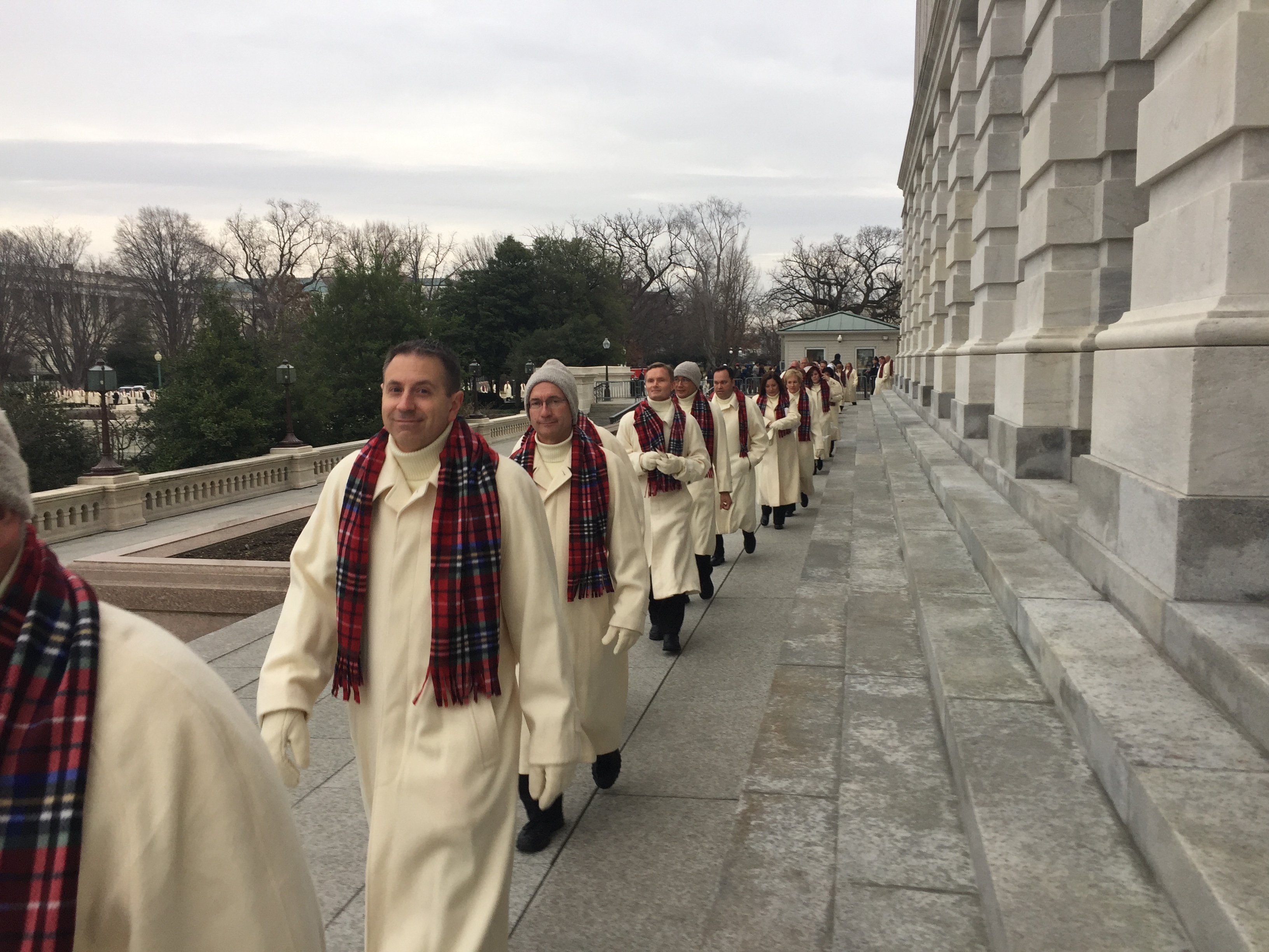 Choir members were dressed in crème-colored coats with matching turtleneck sweaters and red plaid scarves as they sang outdoors under cloudy skies. In all, 215 singers of the 360-member choir, goodwill ambassadors of The Church of Jesus Christ of Latter-day Saints, traveled from Salt Lake City to the nation’s capital for the historic event after accepting an invitation from the U.S. Presidential Inauguration Committee.