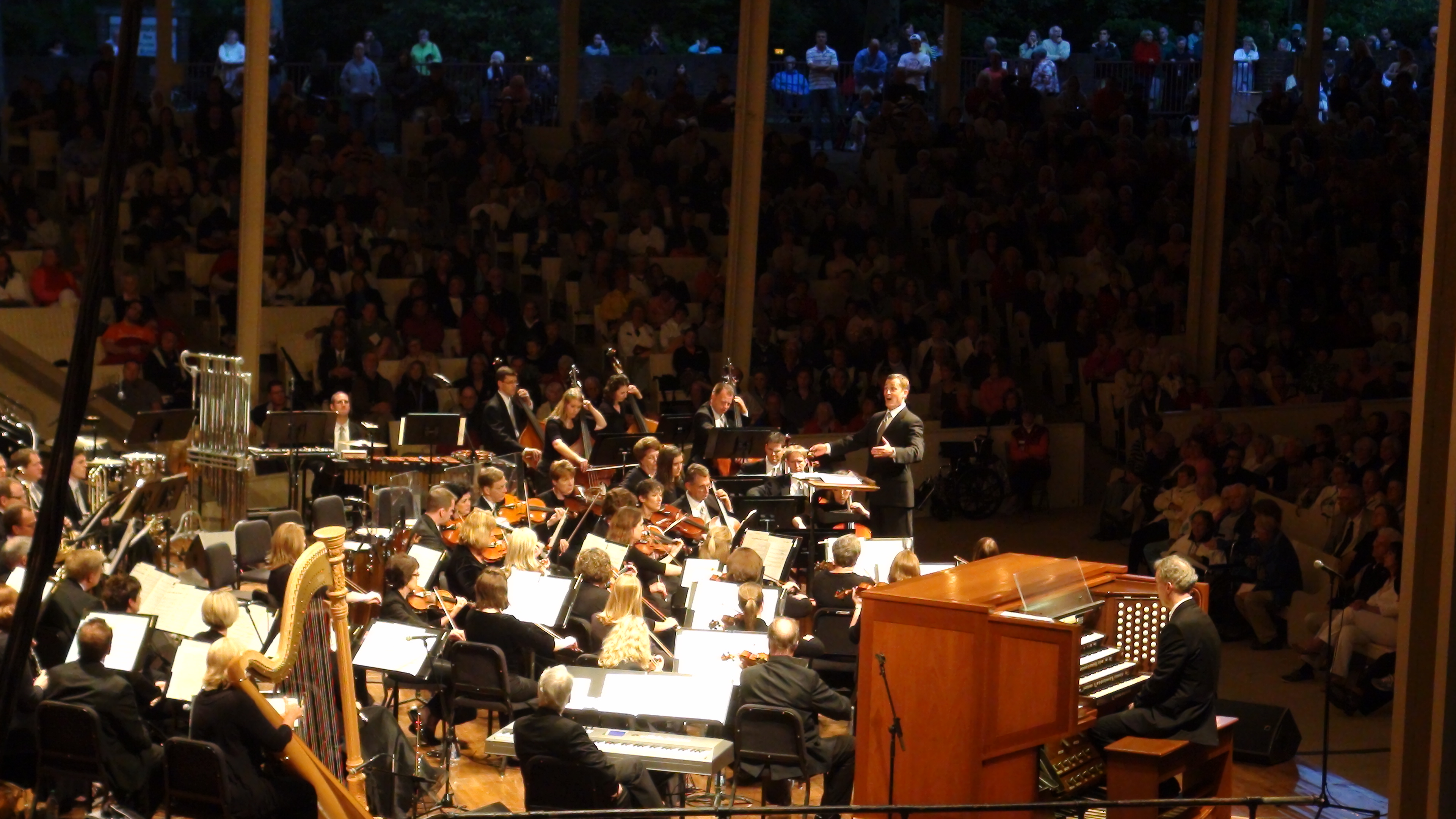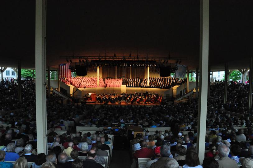 The rainy skies in Chautauqua, New York, did not dampen the enthusiasm of the crowds listening to the Mormon Tabernacle Choir on Saturday, 25 June 2011. During the fourth stop of their week-long summer tour, the choir and Orchestra at Temple Square performed matinee and evening concerts for large audiences who showed their appreciation with several standing ovations.