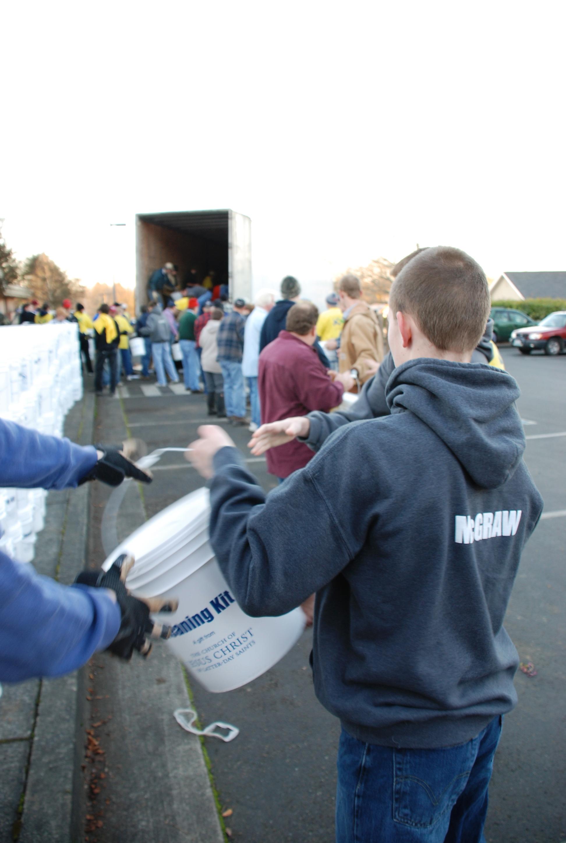 Trucks left Salt Lake City last week carrying over 10,000 cleaning kits to be used in the weekend-long relief efforts. The kits, packed in a reusable bucket, contain rubber gloves, brushes, sponges, rags, trash bags and cleansers.