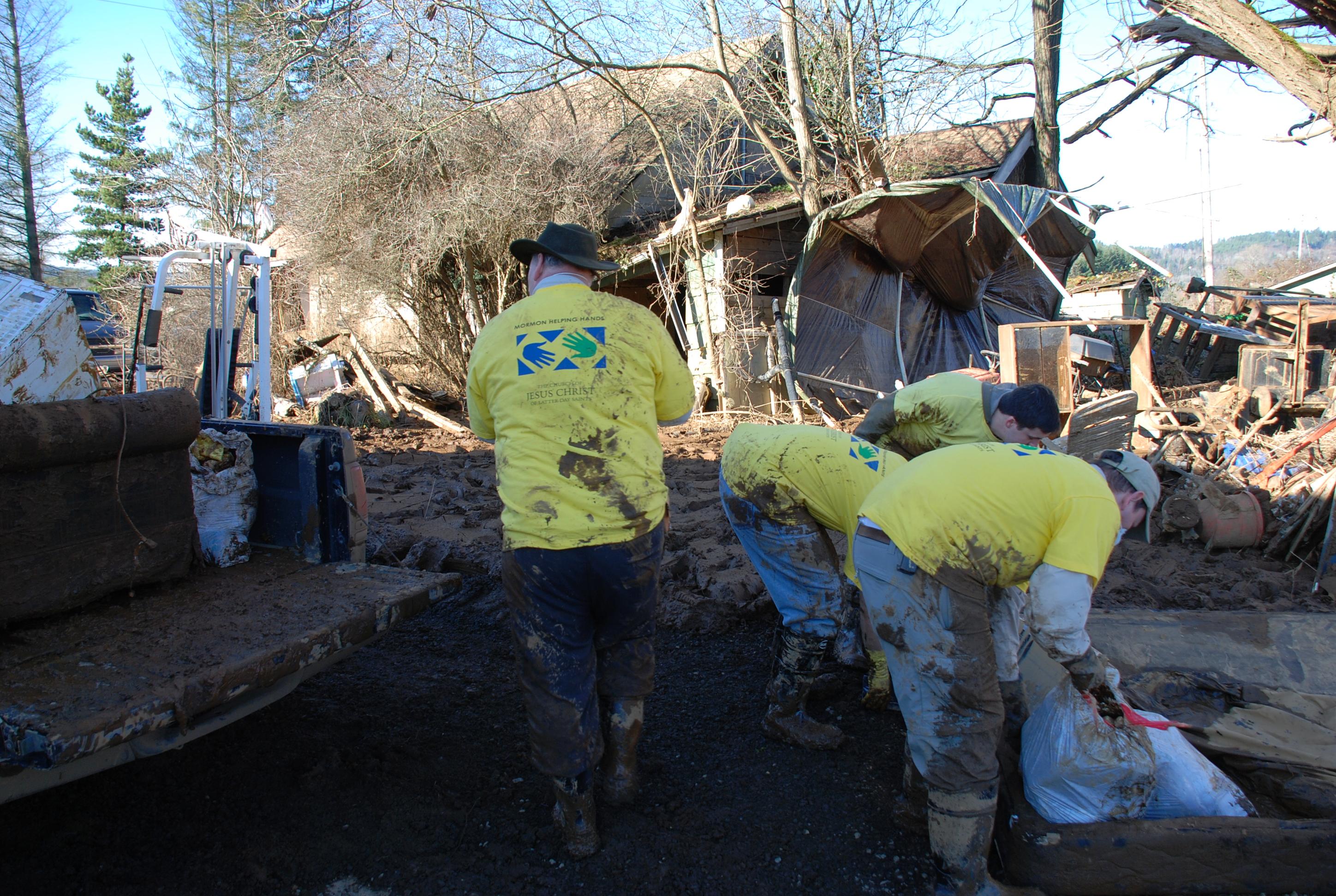 Thousands of volunteers from The Church of Jesus Christ of Latter-day Saints put on waterproof boots, heavy gloves and yellow “Mormon Helping Hands” shirts this weekend to clean up homes and farms in Lewis County devastated by floods.