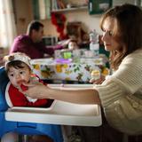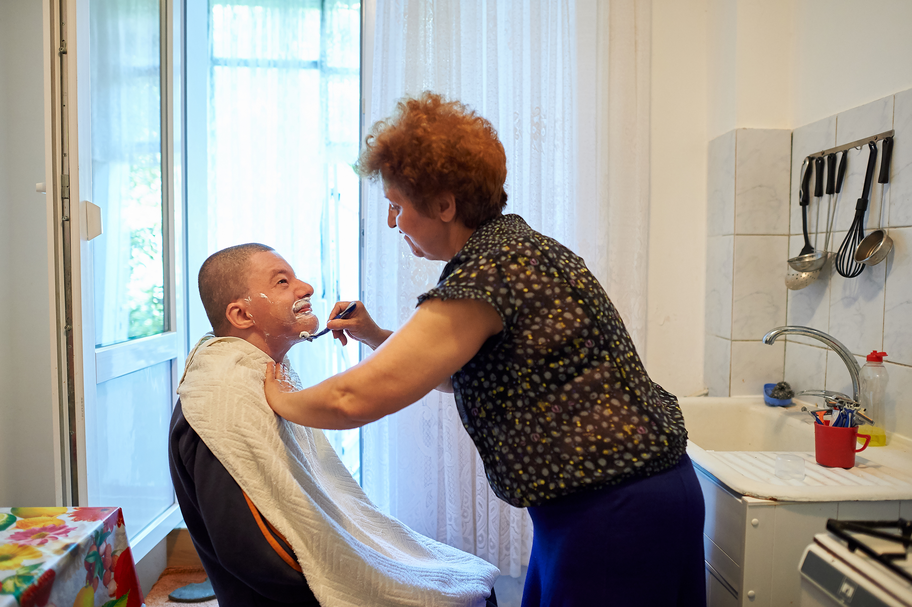 Ionut Siminiuc of Iasi, Romania, suffered brain damage from a difficult birth. His mother, Genoveva, has given him constant care for 29 years.