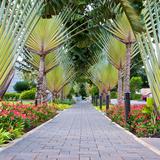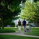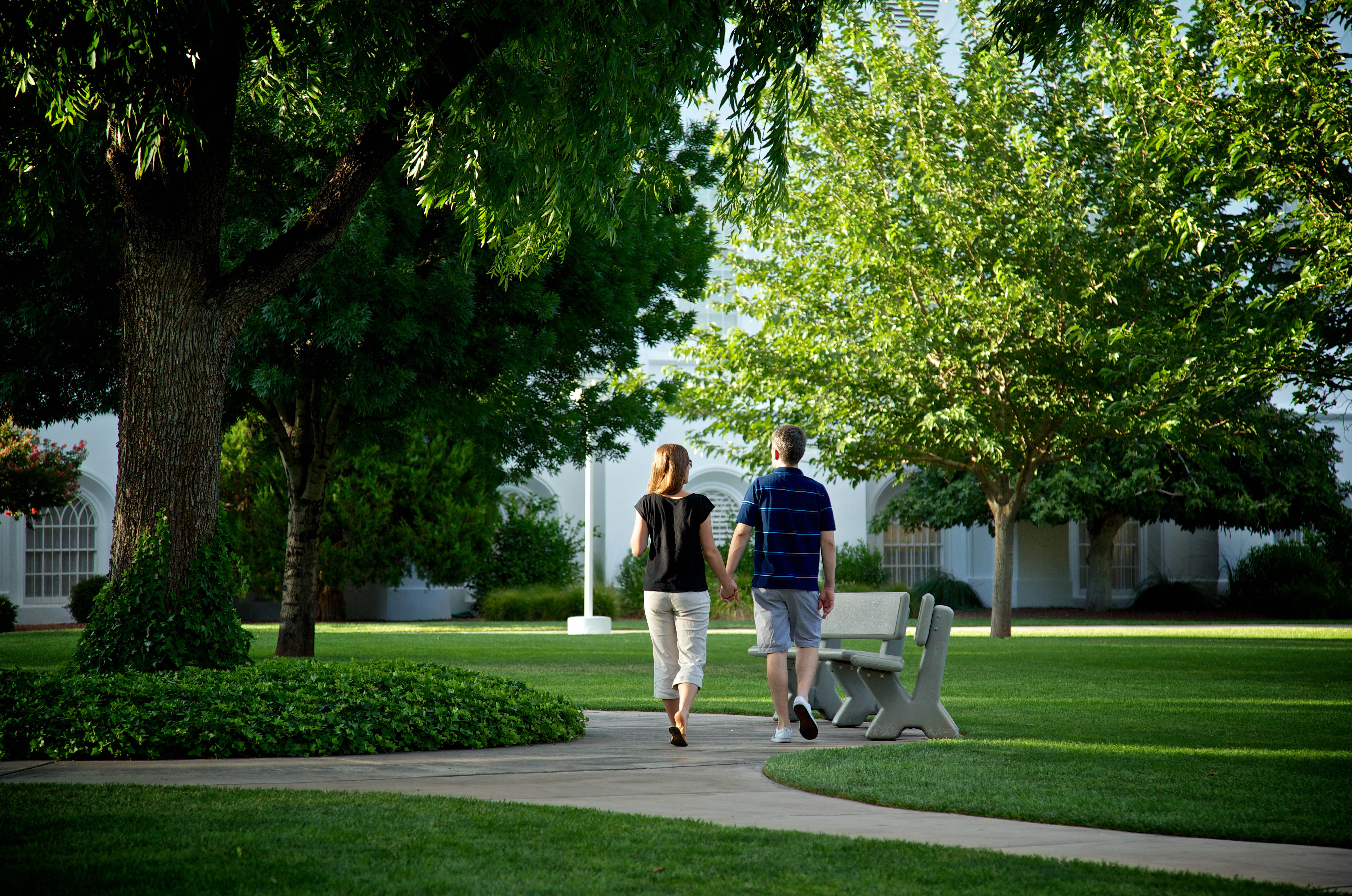 A couple enjoys a walk around the St. George Temple in southern Utah