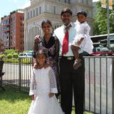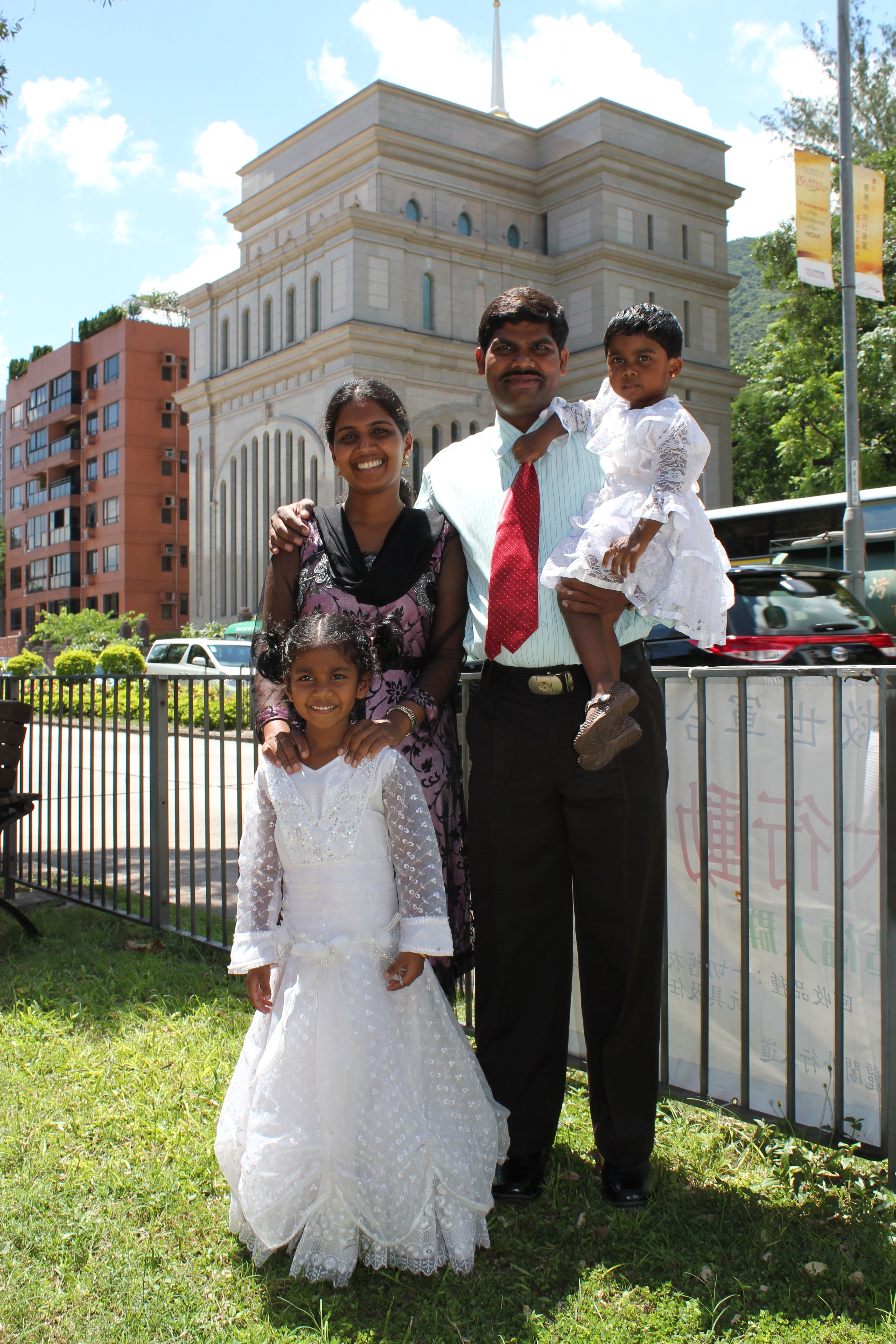 A family poses in front of the Hong Kong Temple following their sealing