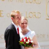 Wedding day for a Latter-day Saint couple posing for photos outside a Mormon temple