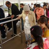 Visitors prepare to enter the Tegucigalpa Honduras Temple during the open house. Shoe covers are worn to protect the temple floors.