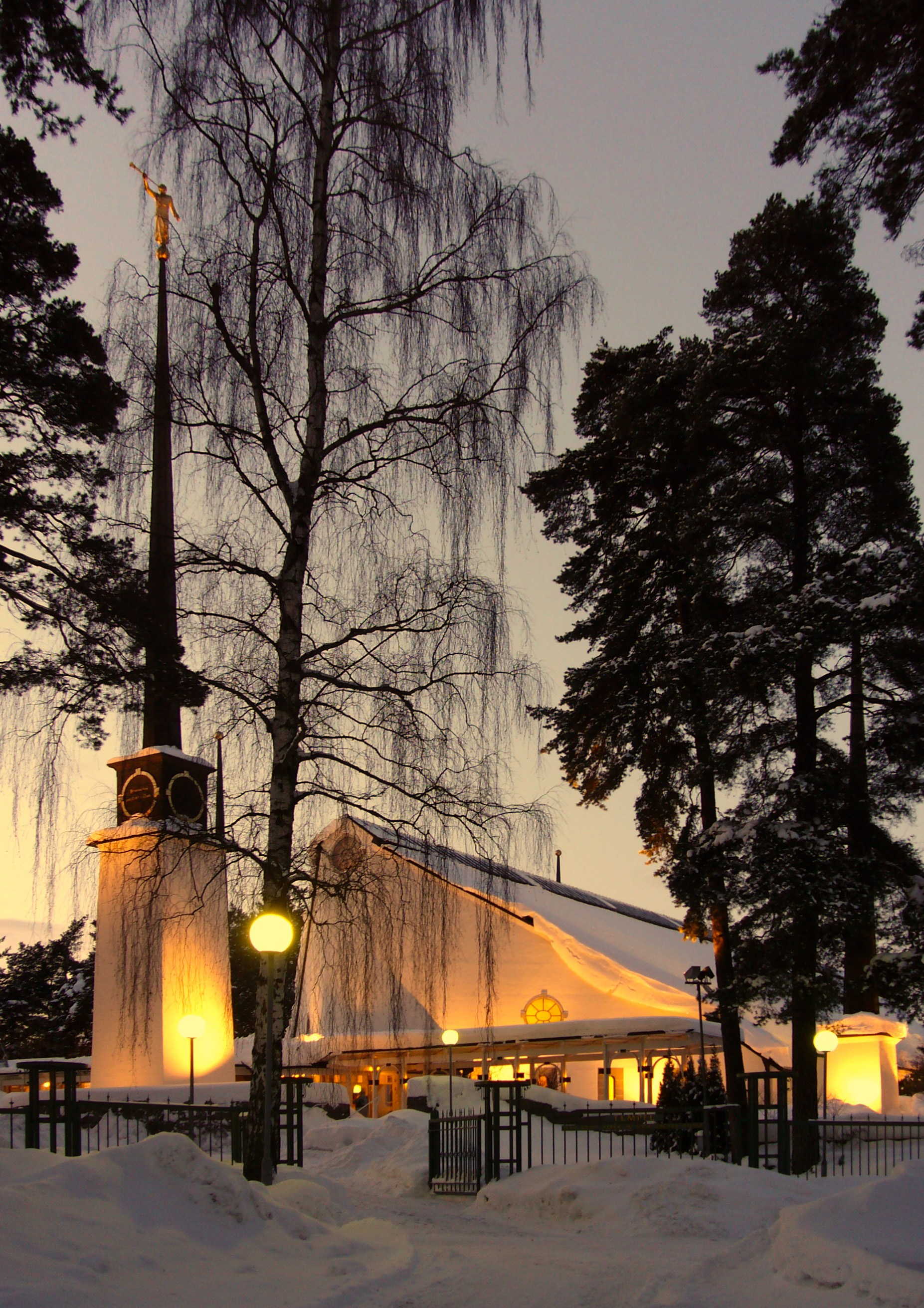 On most temples there is a golden statue of a man in flowing robes, with a long horn pressed to his lips. The statue depicts the angel Moroni, an ancient prophet and a central figure in the Book of Mormon. The statue is symbolic of the preaching of the gospel of Jesus Christ to the world.