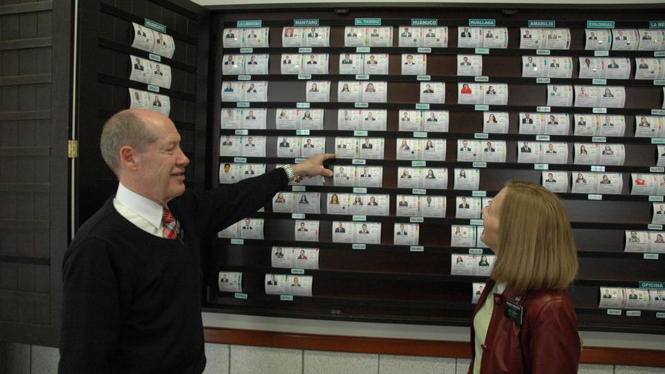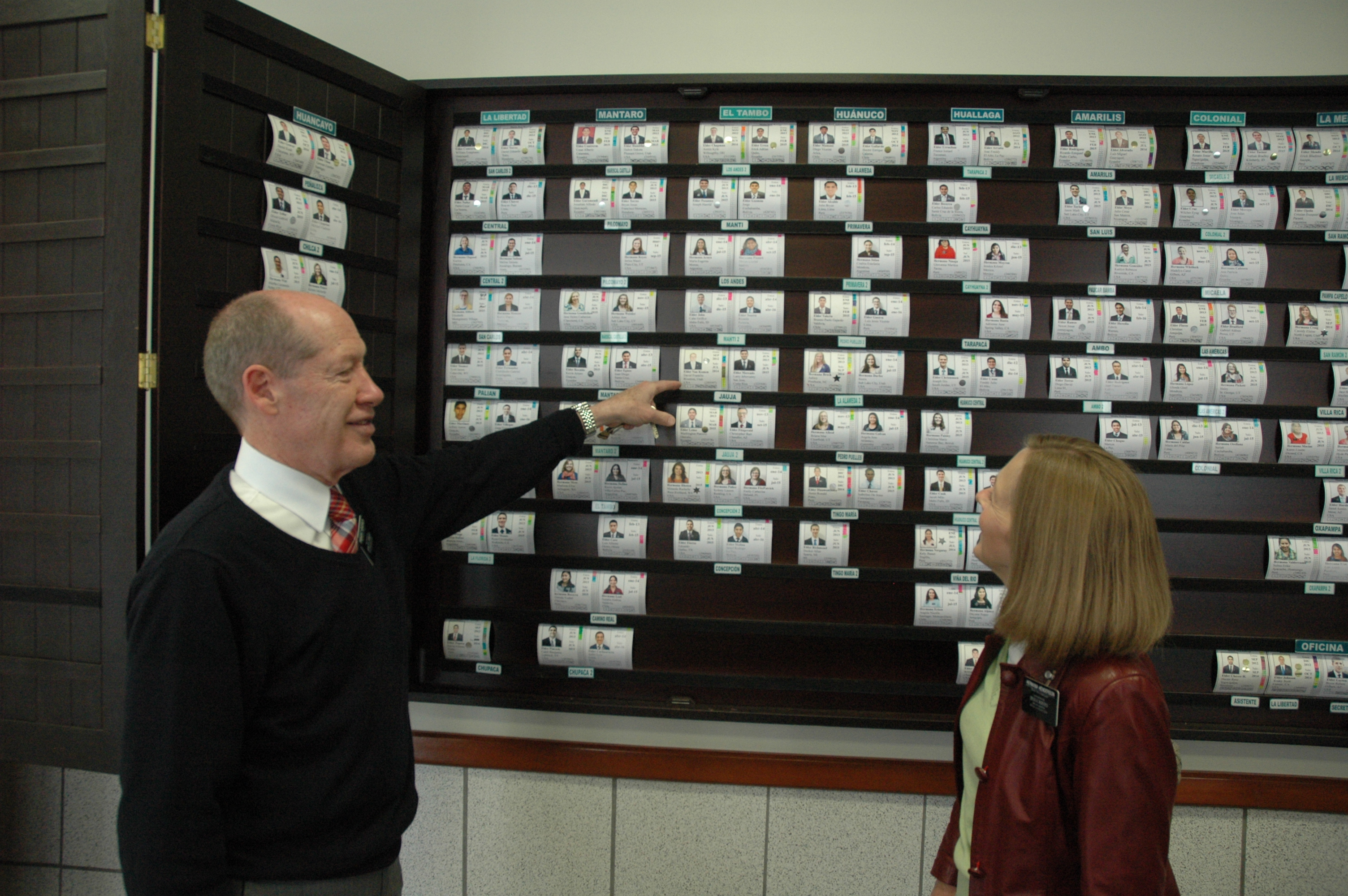 President David and Sister Paula Henderson currently preside in the Peru Huancayo Mission and study the assignments board to determine placement of the newly arriving missionaries.