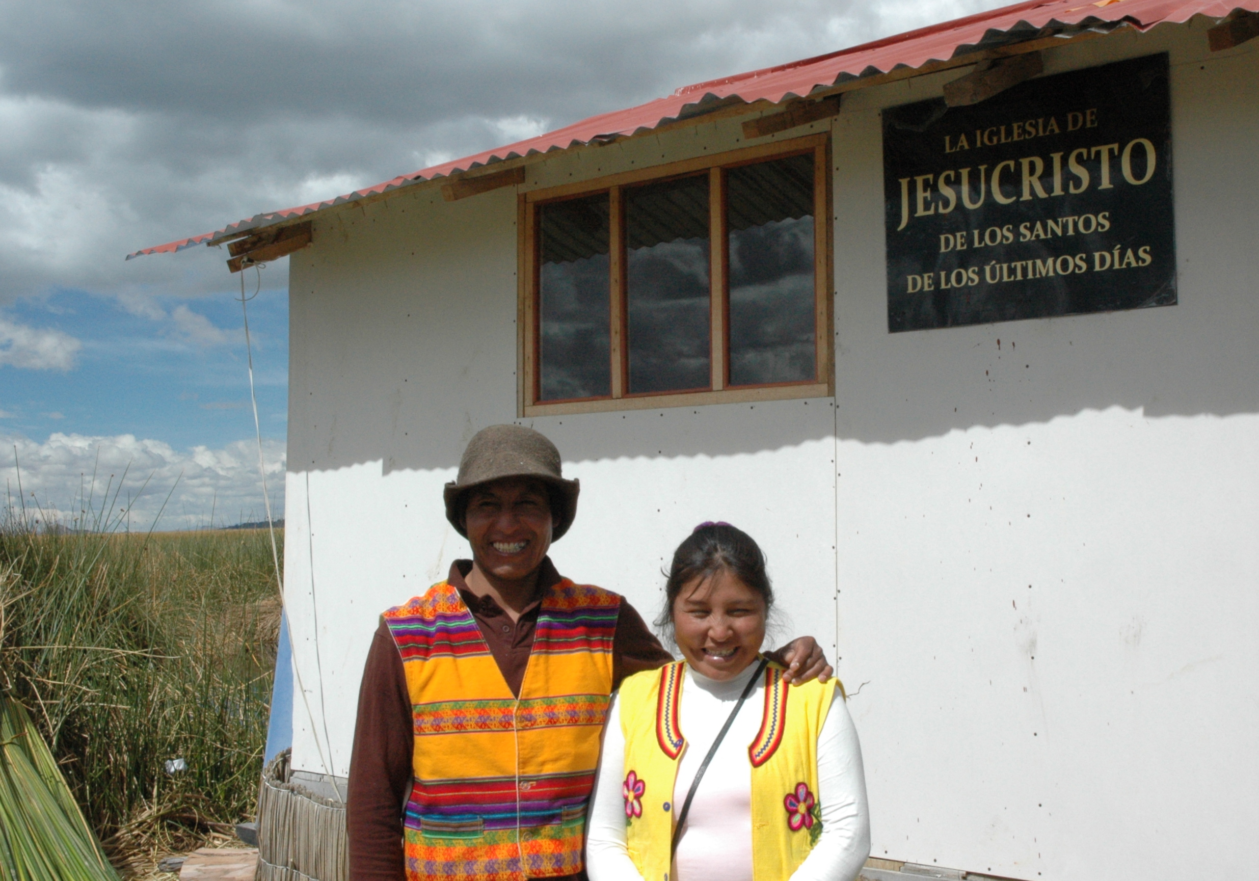 Nelson and Dora Coila welcome guests to their newly constructed meetinghouse, built on totora reeds in the floating islands of Lake Titicaca, Peru. The islands reportedly predate the Inca civilization. Each island is four to eight feet thick and includes a collection of reed structures. The Uros people add more reeds to the surface as the plant material disintegrates.