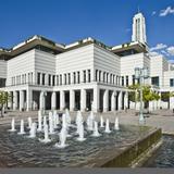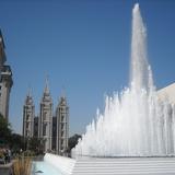 The Church Office Building fountain is a 294-jet fountain mirroring the spires of the Salt Lake Temple with water rising 50 feet above a reflective pool. From the fountain, streamlets of recirculated water run west alongside pathways that finish near the Main Street Plaza reflecting pond and temple.